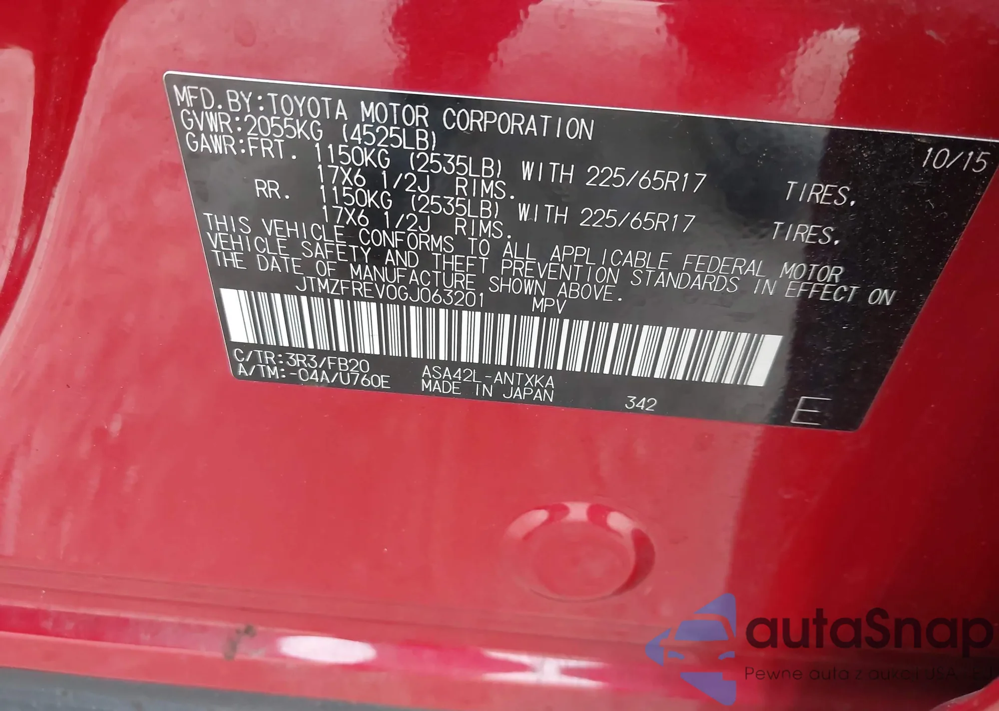 LOT: 41160385 VIN: JTMZFREV0GJ063201