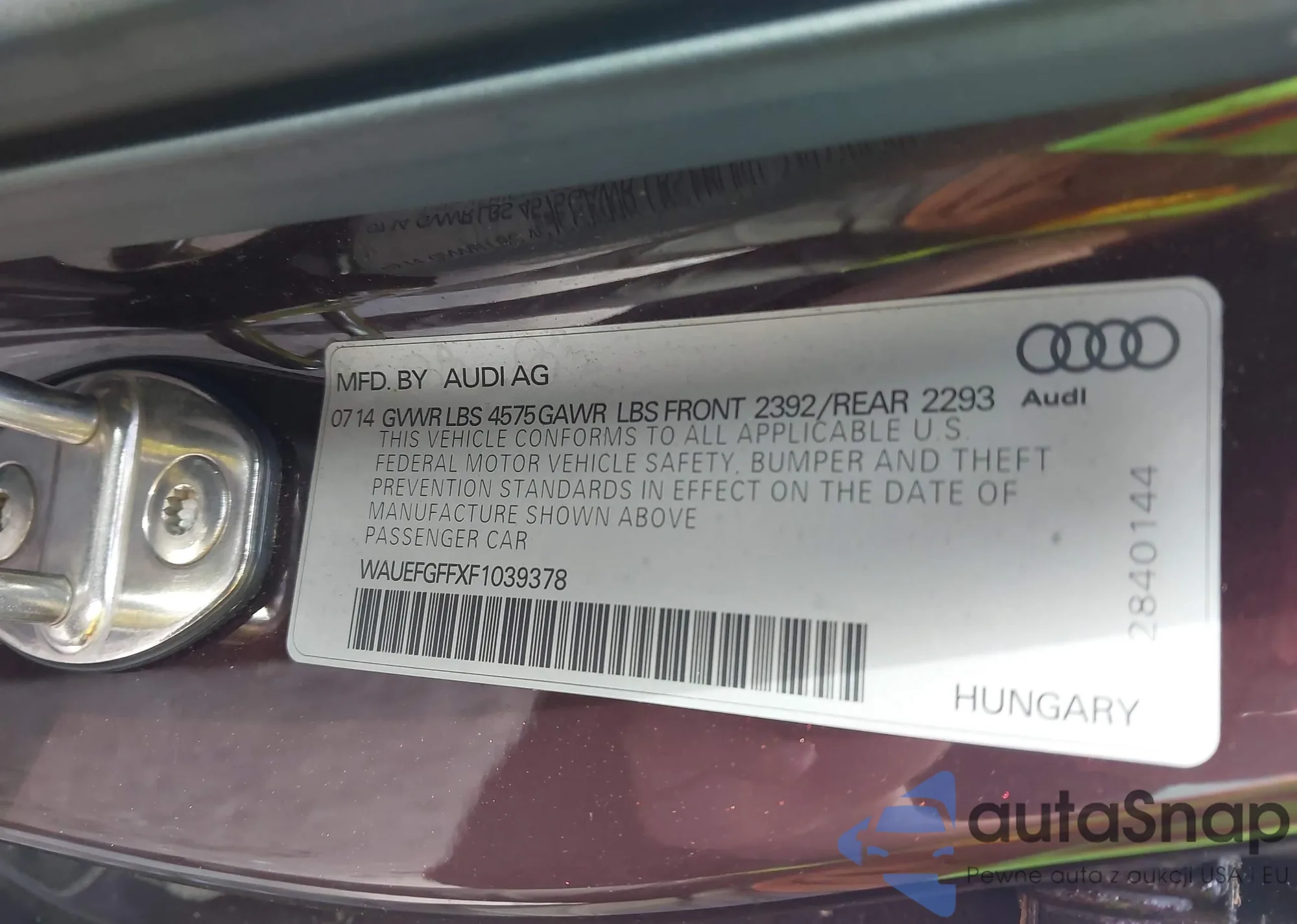 LOT: 40862412 VIN: WAUEFGFFXF1039378