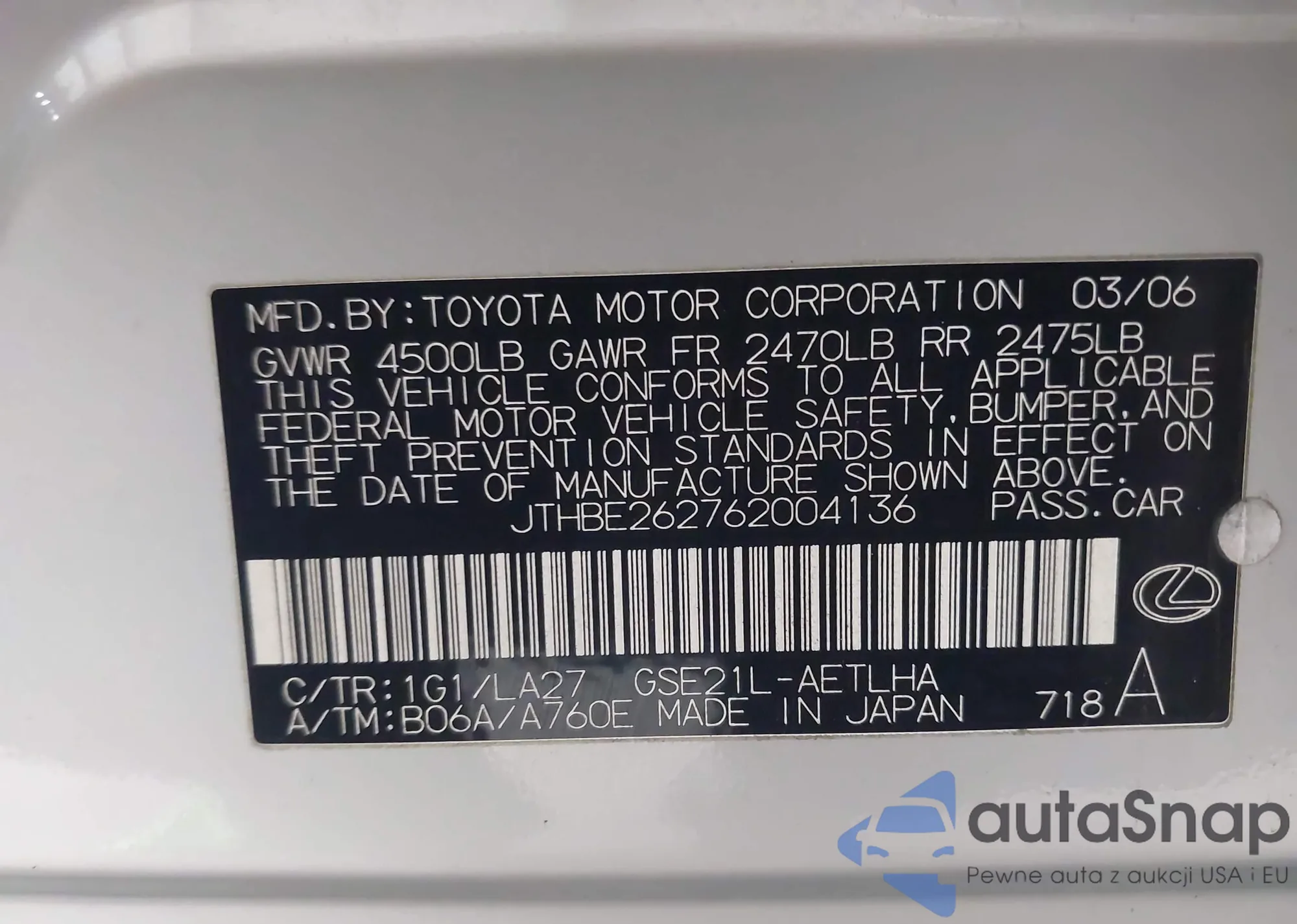 LOT: 41193567 VIN: JTHBE262762004136
