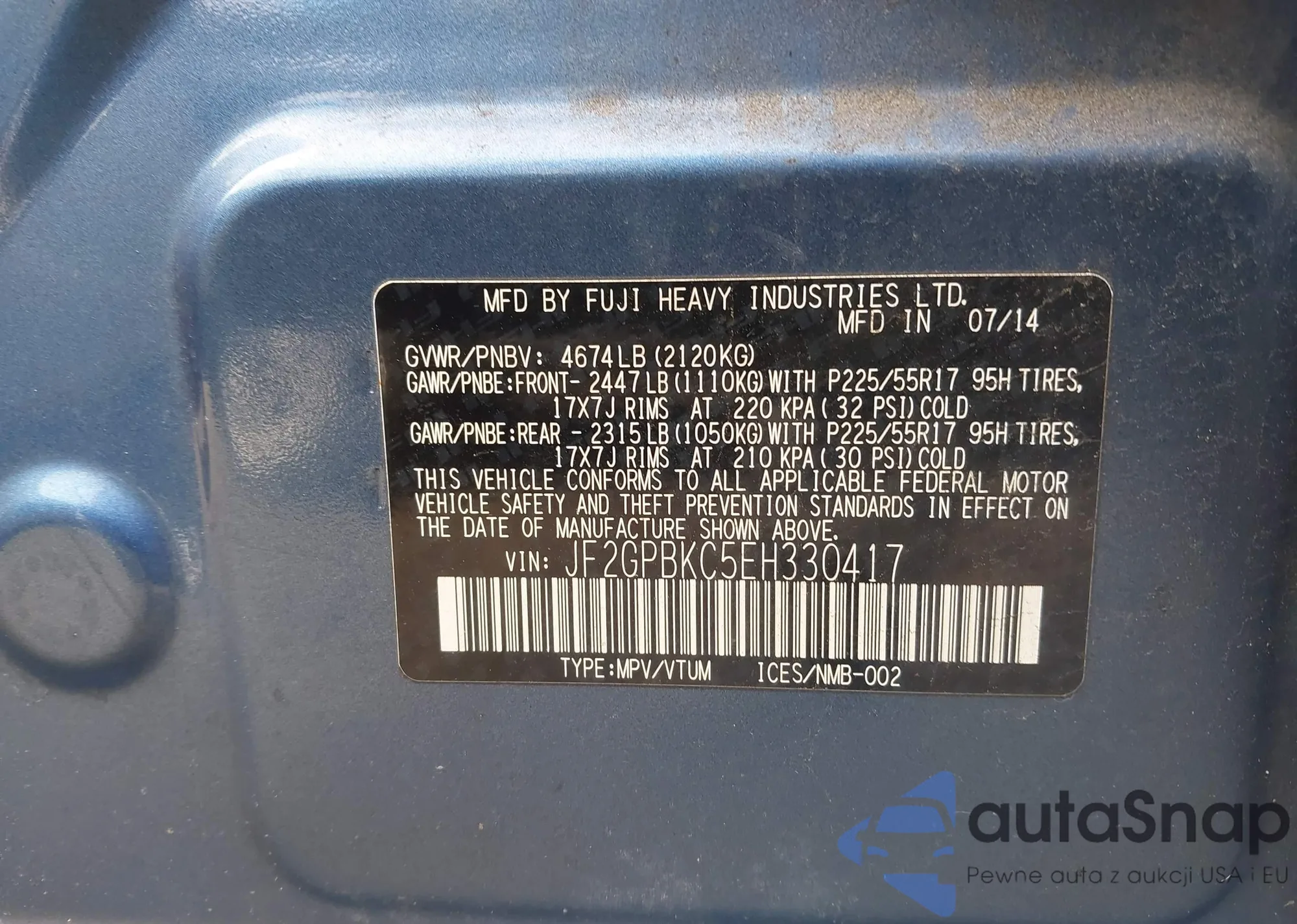 • VIN JF2GPBKC5EH330417