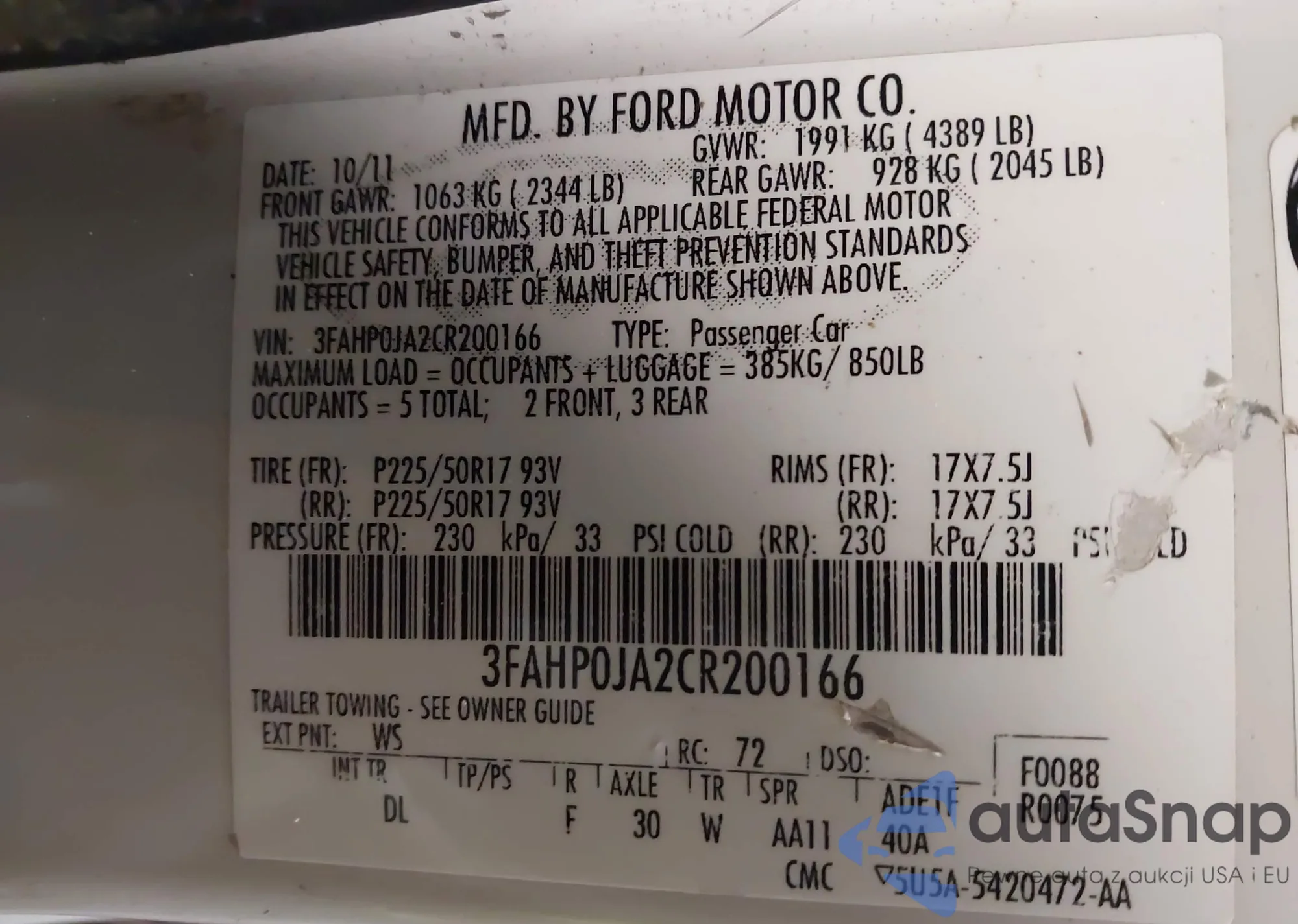• VIN 3FAHP0JA2CR200166