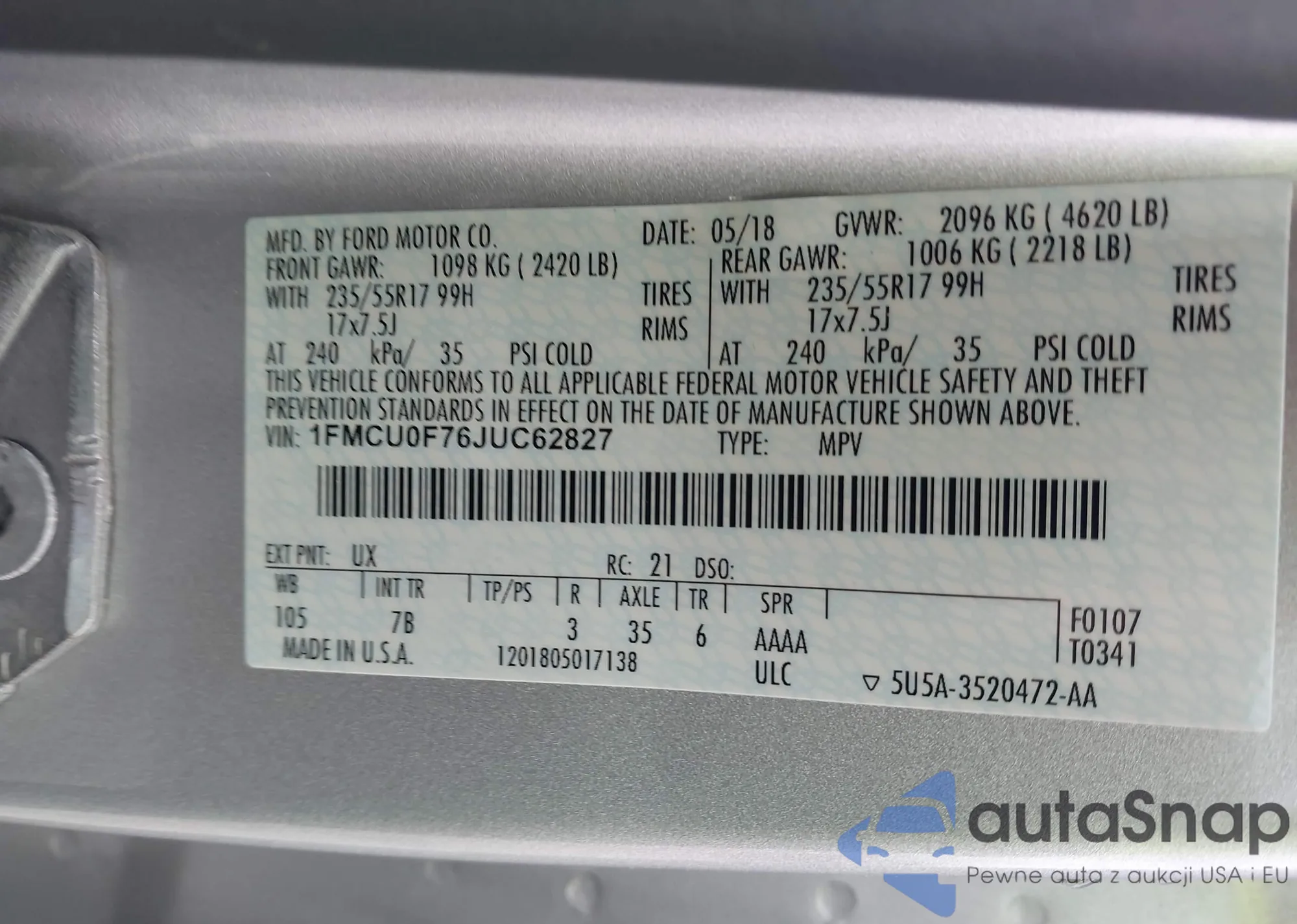 LOT: 41810056 VIN: 1FMCU0F76JUC62827