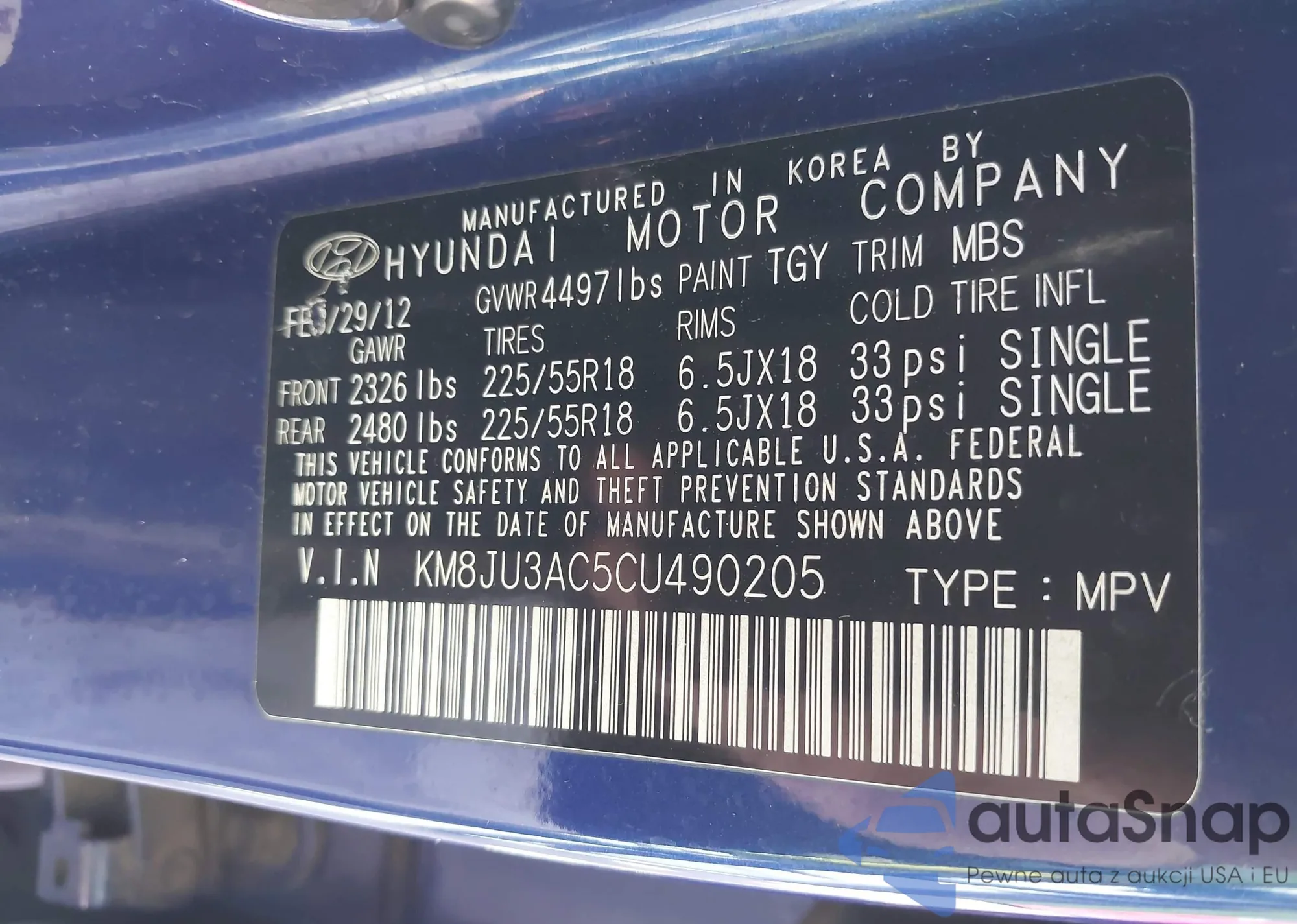 LOT: 41867099 VIN: KMHCU4AE0CU226213