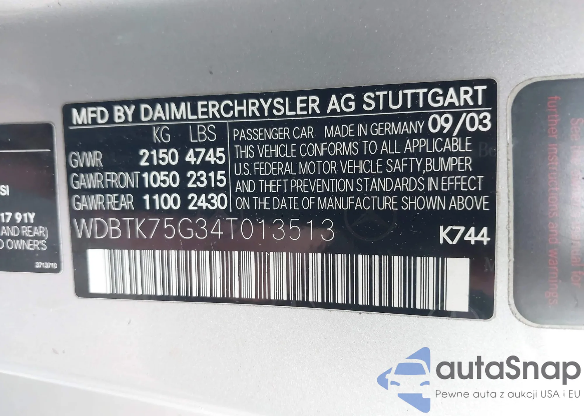 LOT: 40490691 VIN: WDBTK75G34T013513