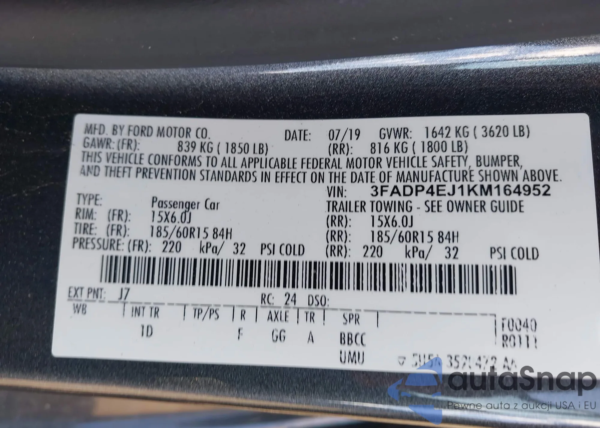 LOT: 41729553 VIN: 3FADP4EJ1KM164952