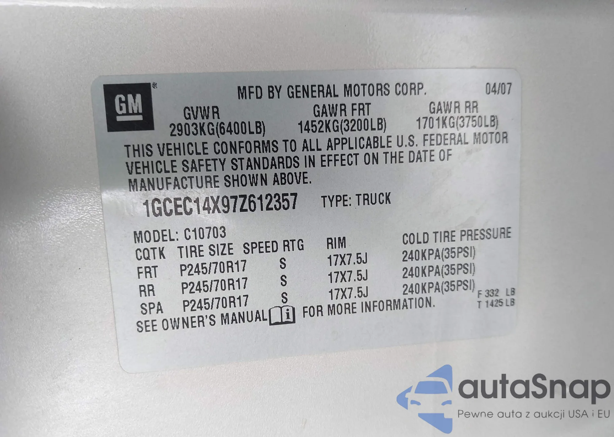 • VIN 1GCEC14X97Z612357