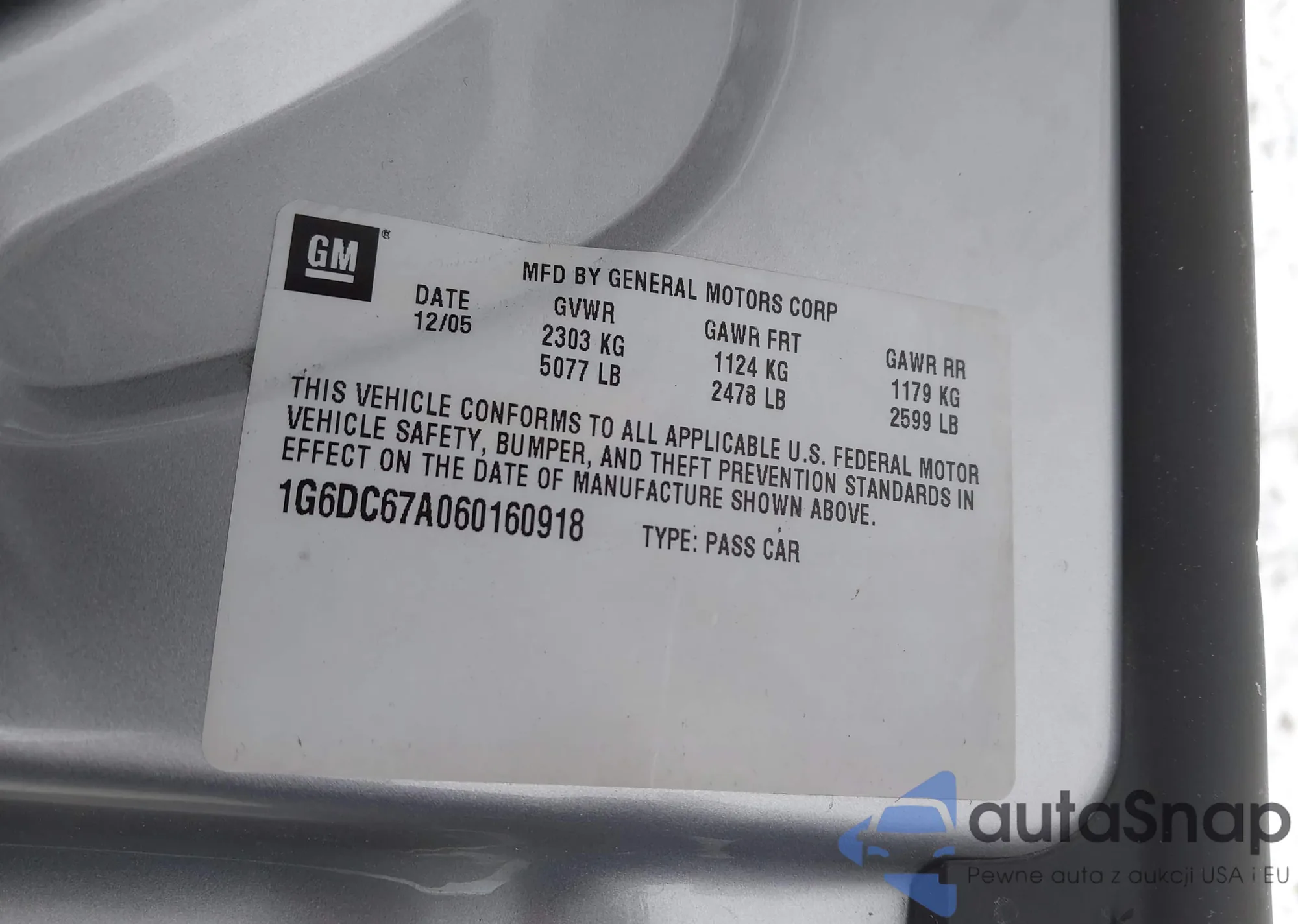 LOT: 41635278 VIN: 1G6DC67A060160918
