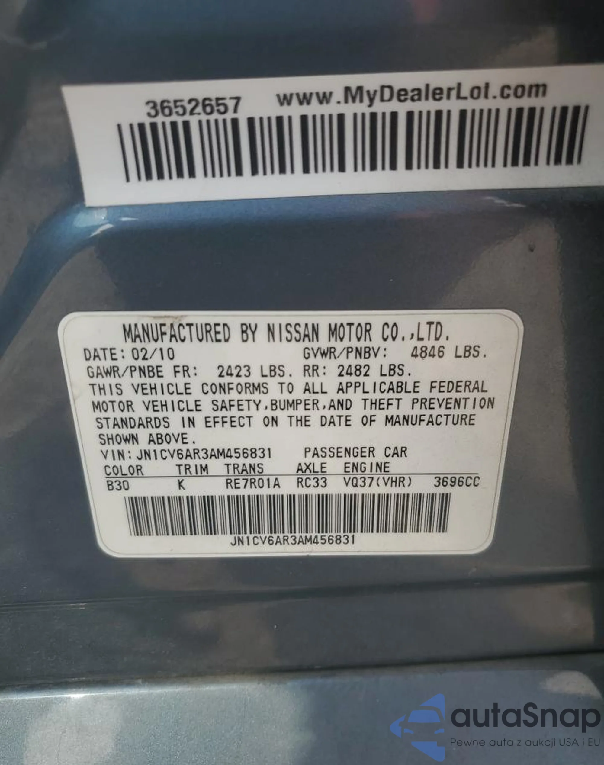 LOT: 71026804 VIN: JN1CV6AR3AM456831