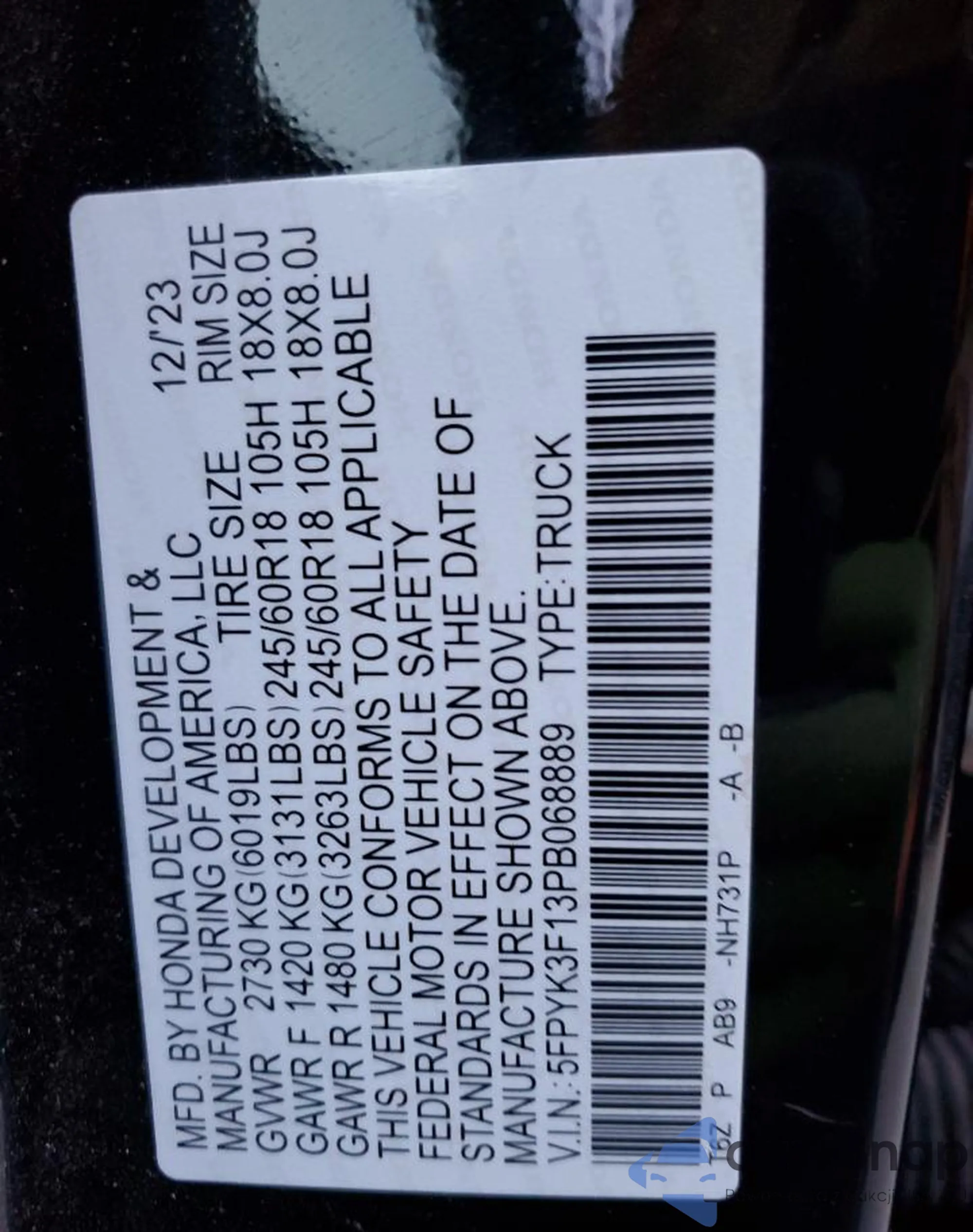 • VIN 5FPYK3F13PB068889