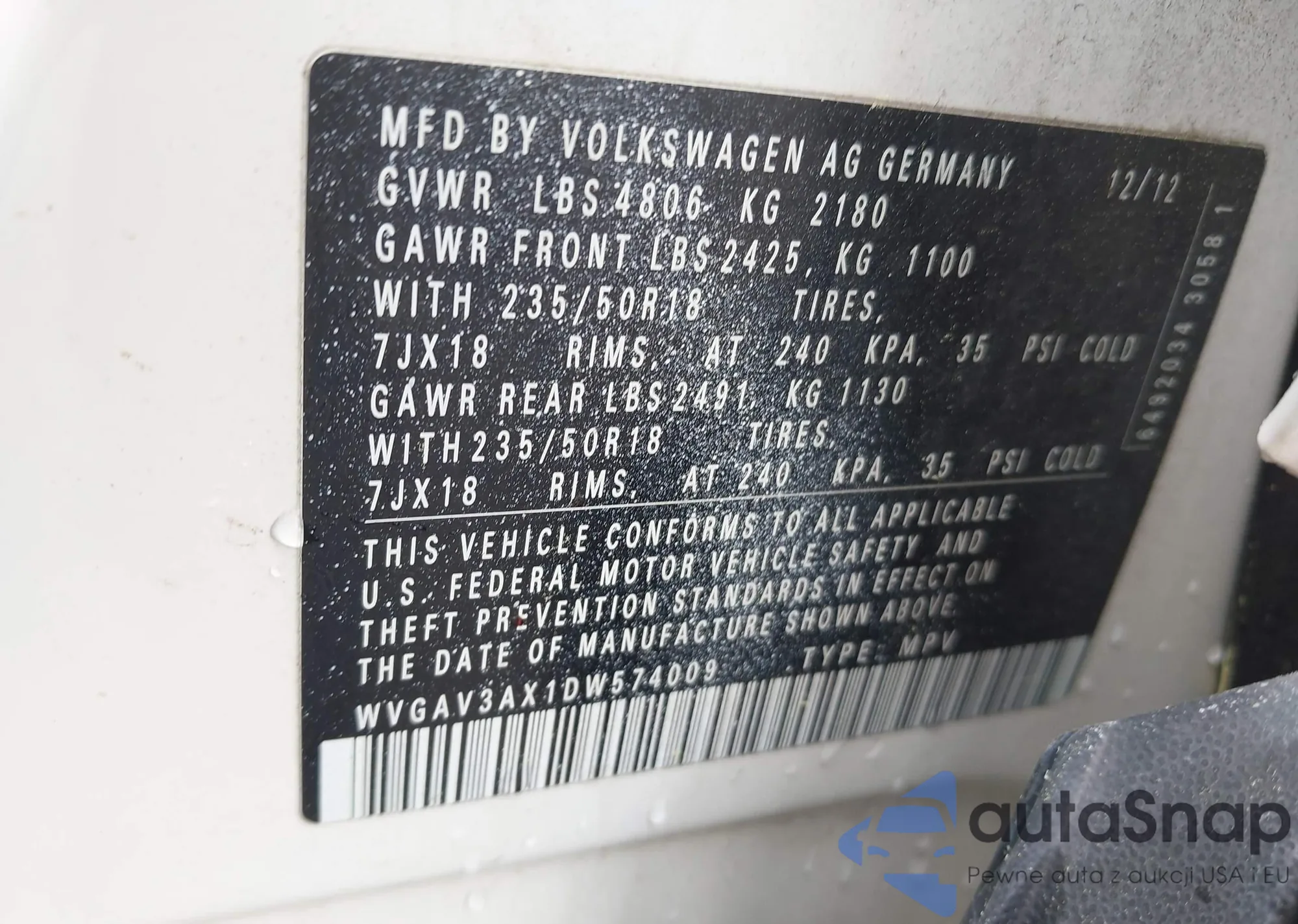 LOT: 41935273 VIN: WVGAV3AX1DW574009