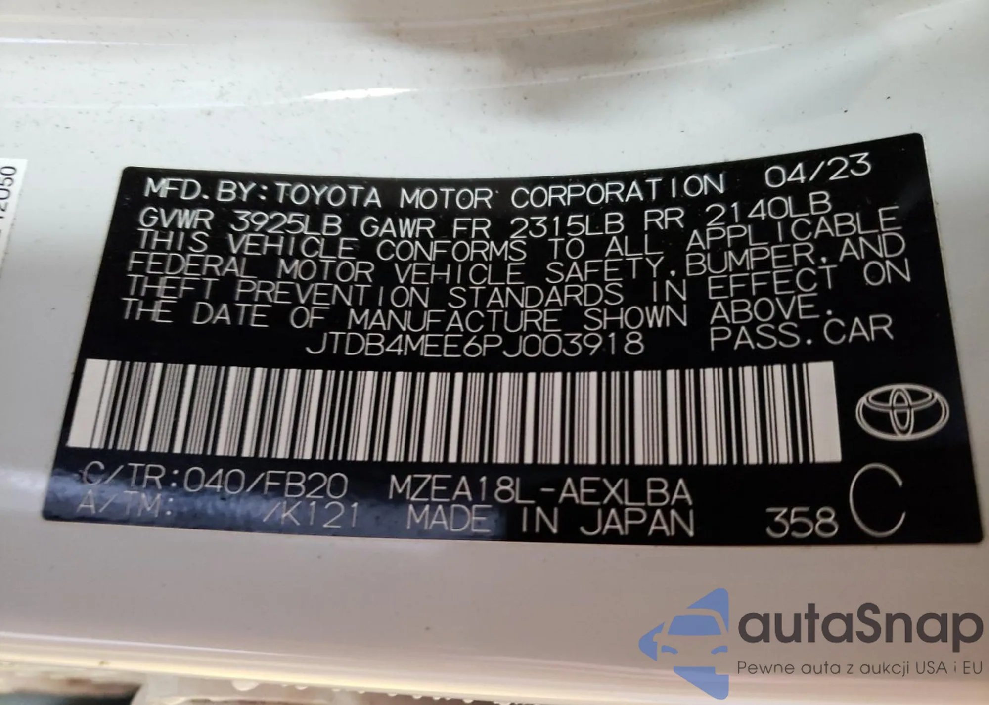 LOT: 41460435 VIN: JTDB4MEE6PJ003918
