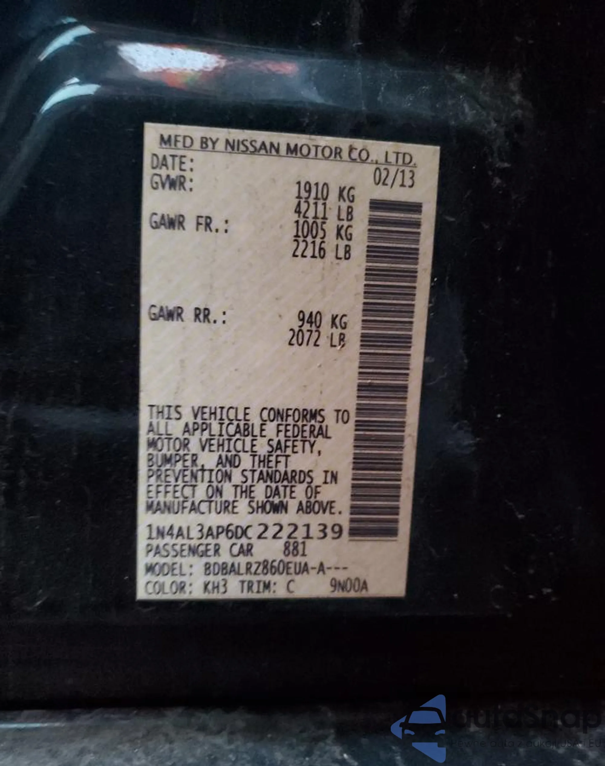 • VIN 1N4AL3AP6DC222139