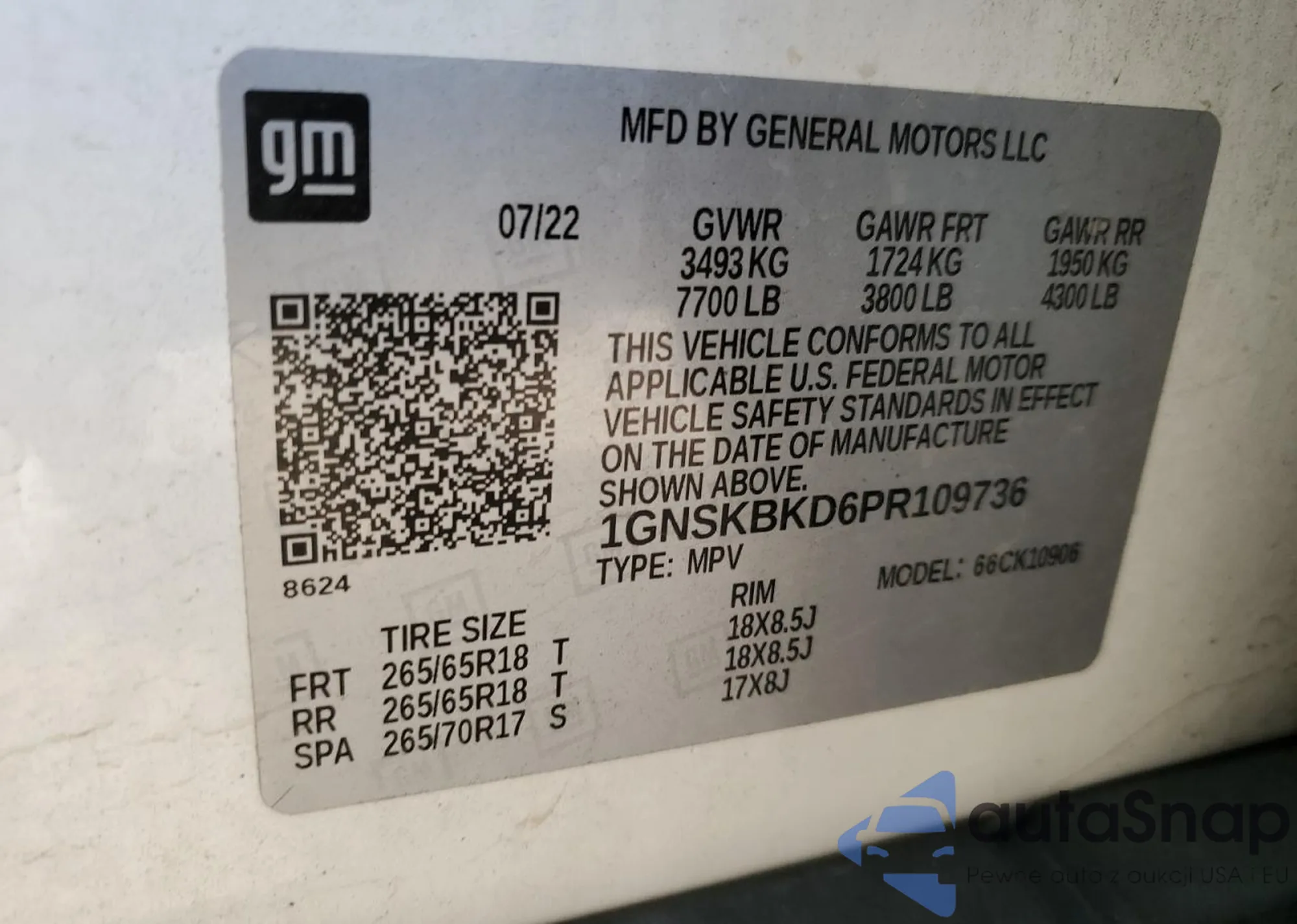LOT: 76605194 VIN: 1GNSKBKD6PR109736