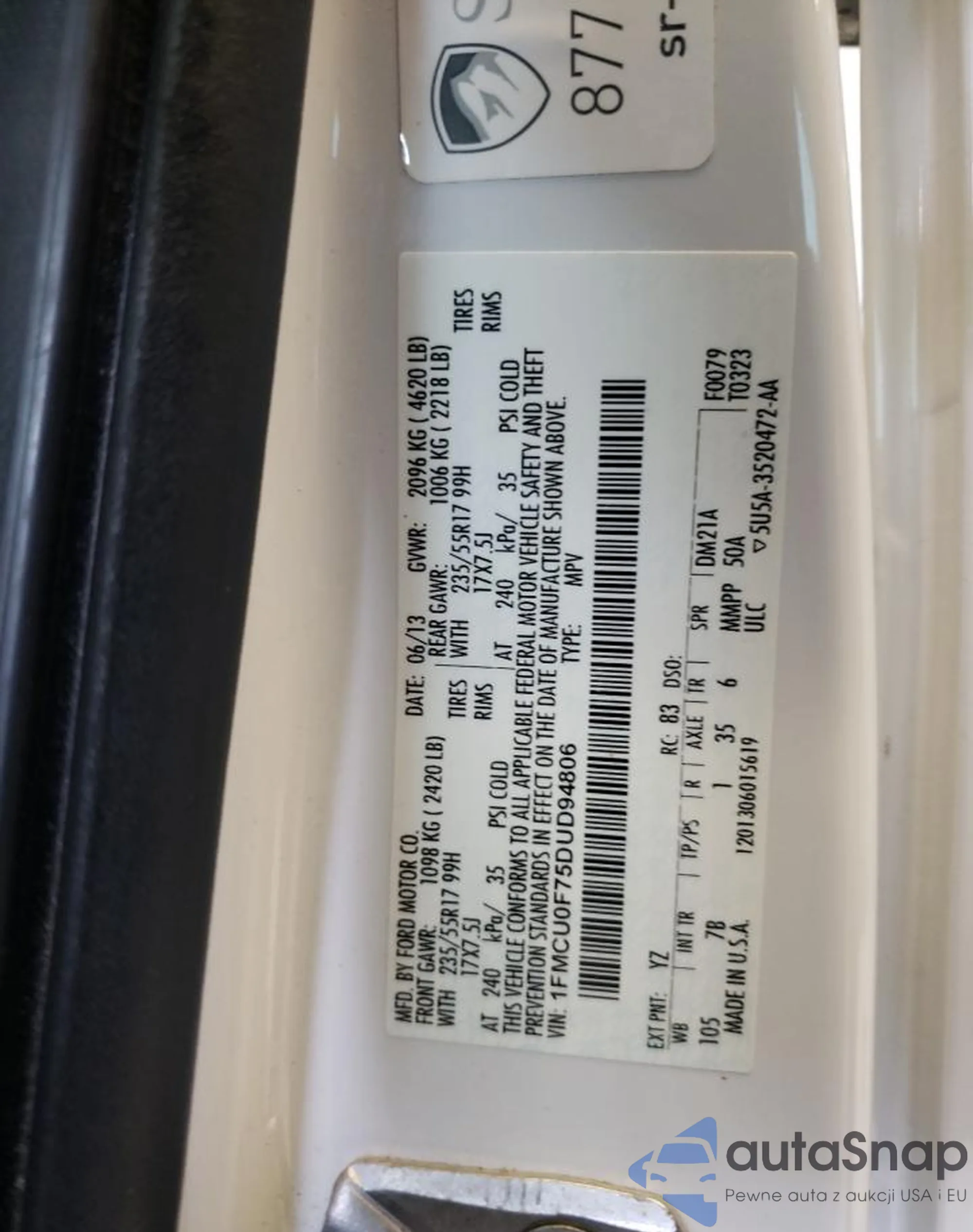 • VIN 1FMCU0F75DUD94806