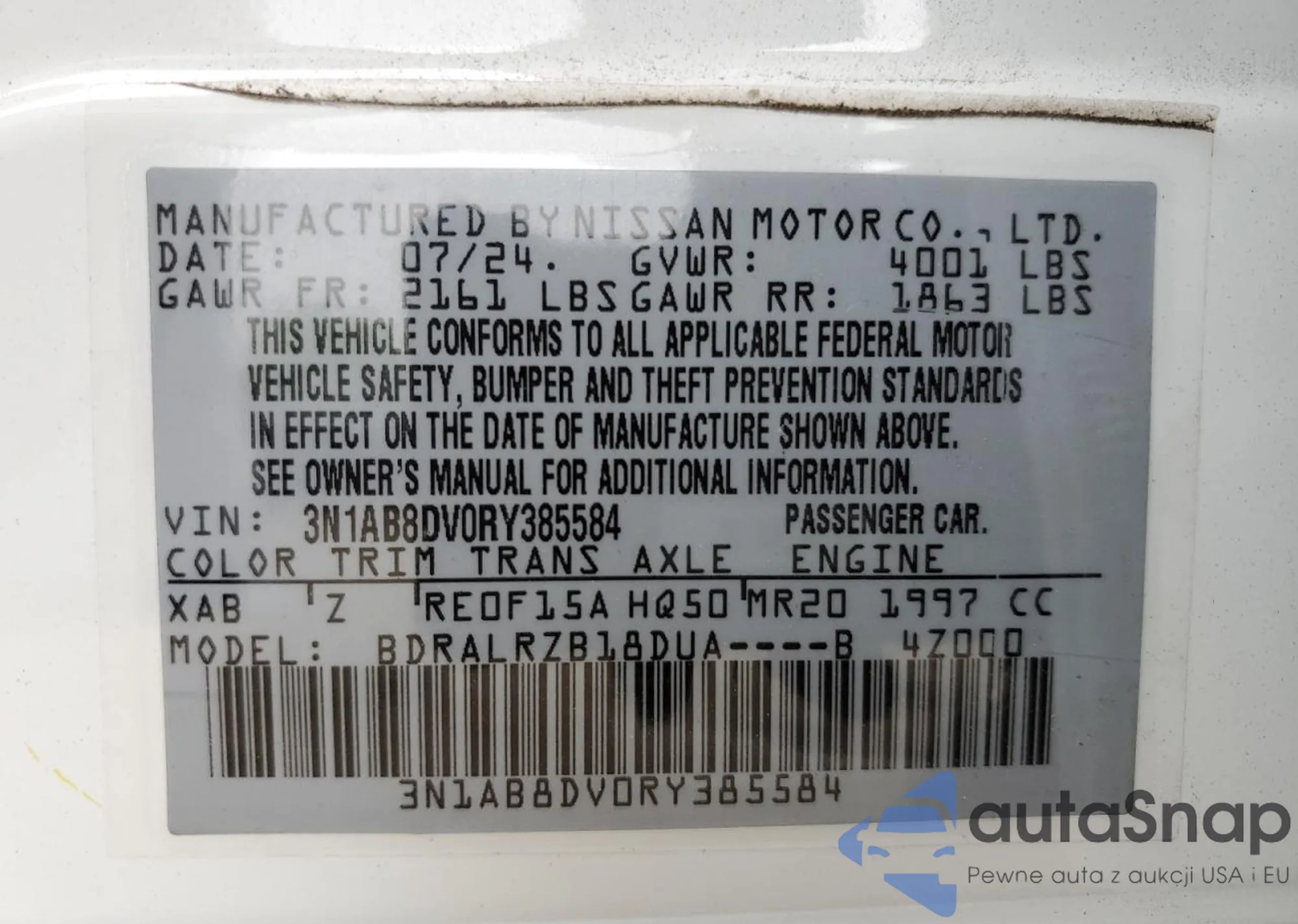 • VIN 3N1AB8DV0RY385584