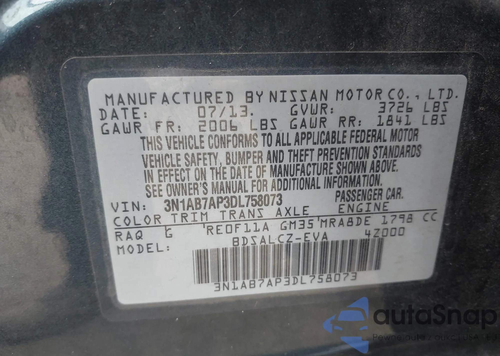 • VIN 3N1AB7AP3DL758073