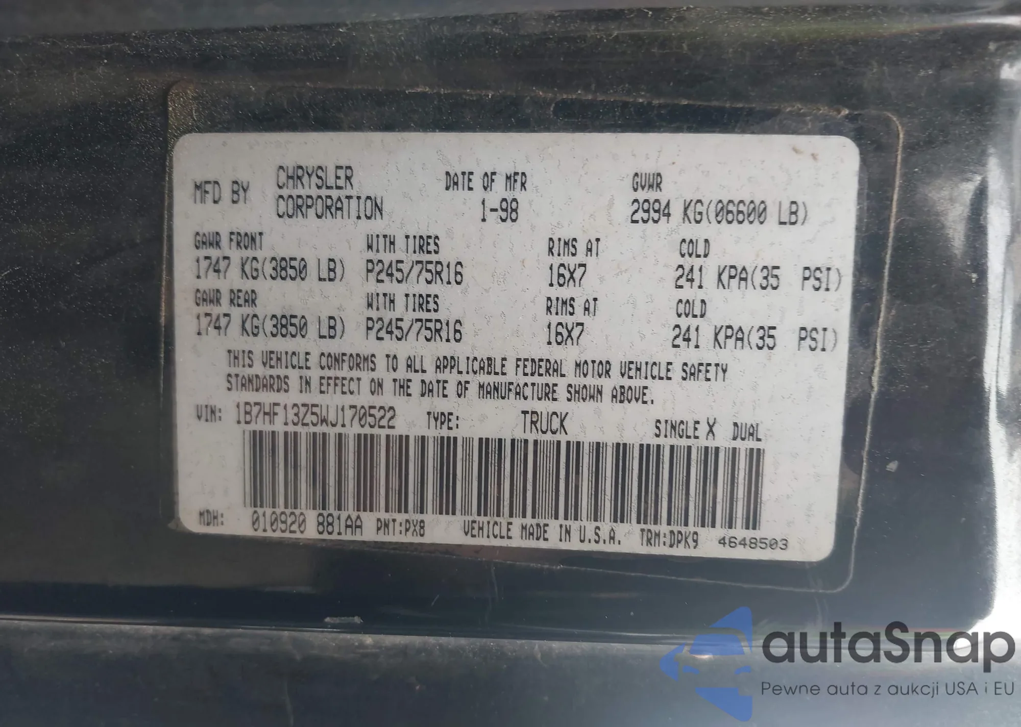 • VIN 1B7HF13Z5WJ170522