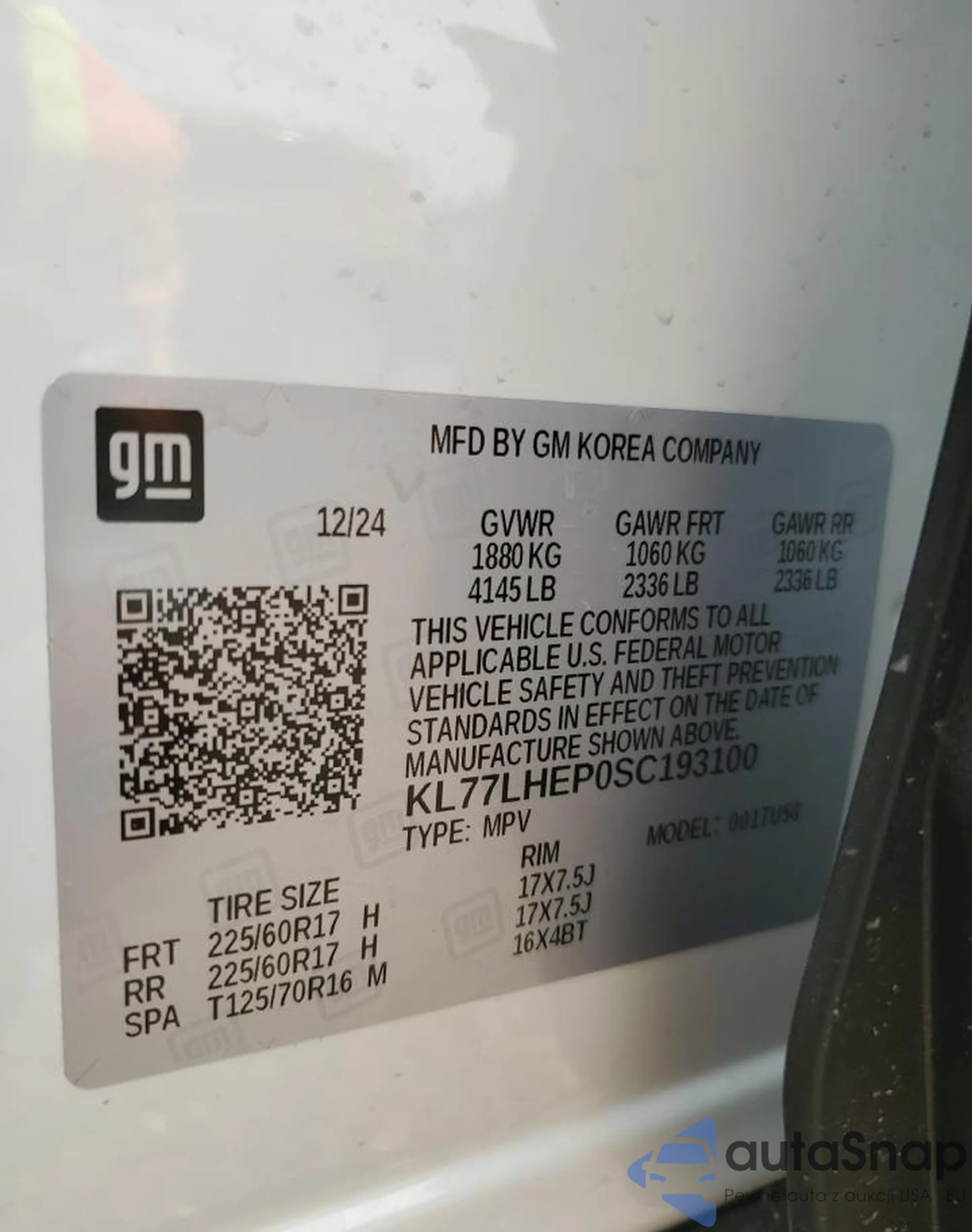 LOT: 52037405 VIN: KL77LHEP0SC193100