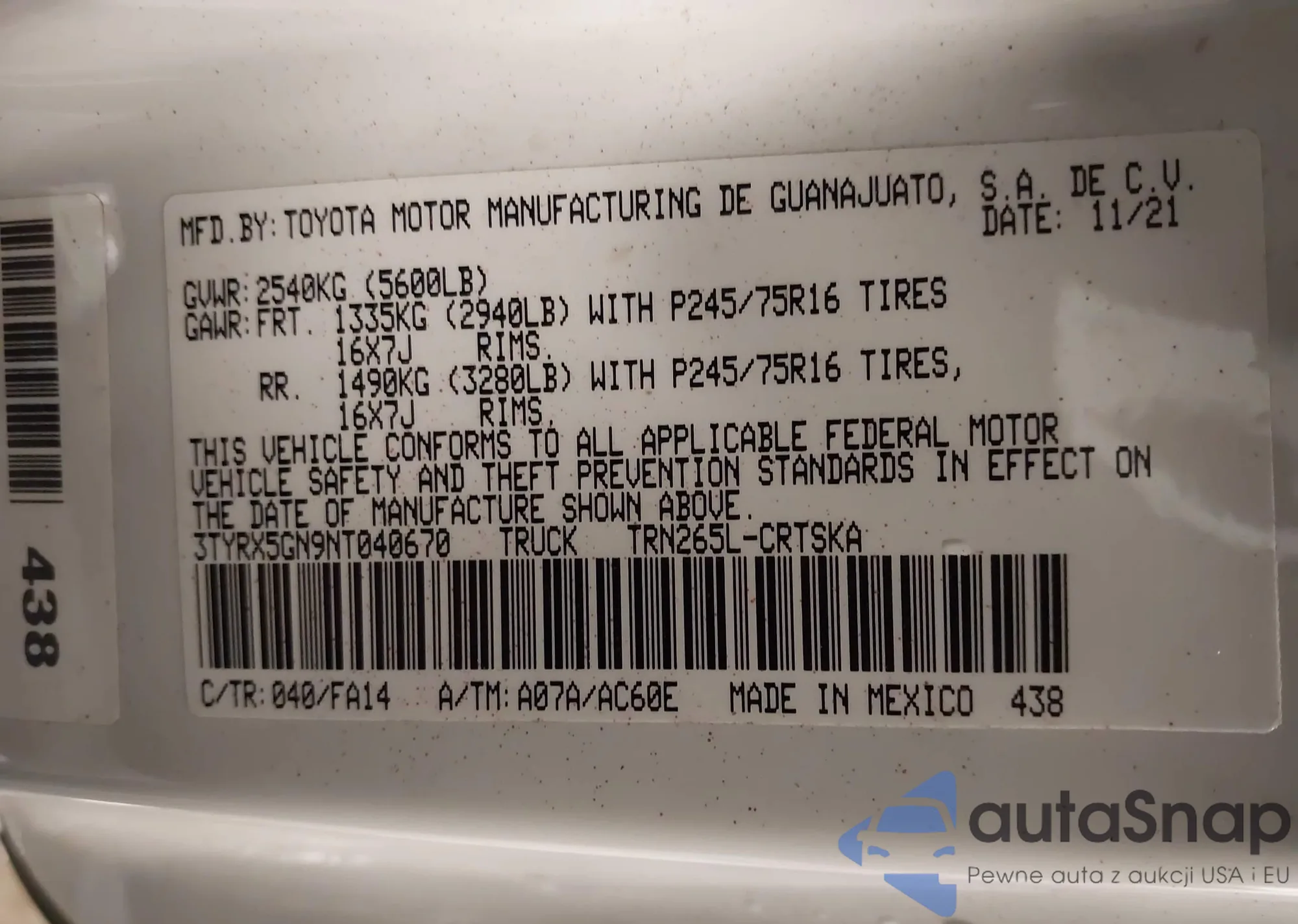 • VIN 3TYRX5GN9NT040670