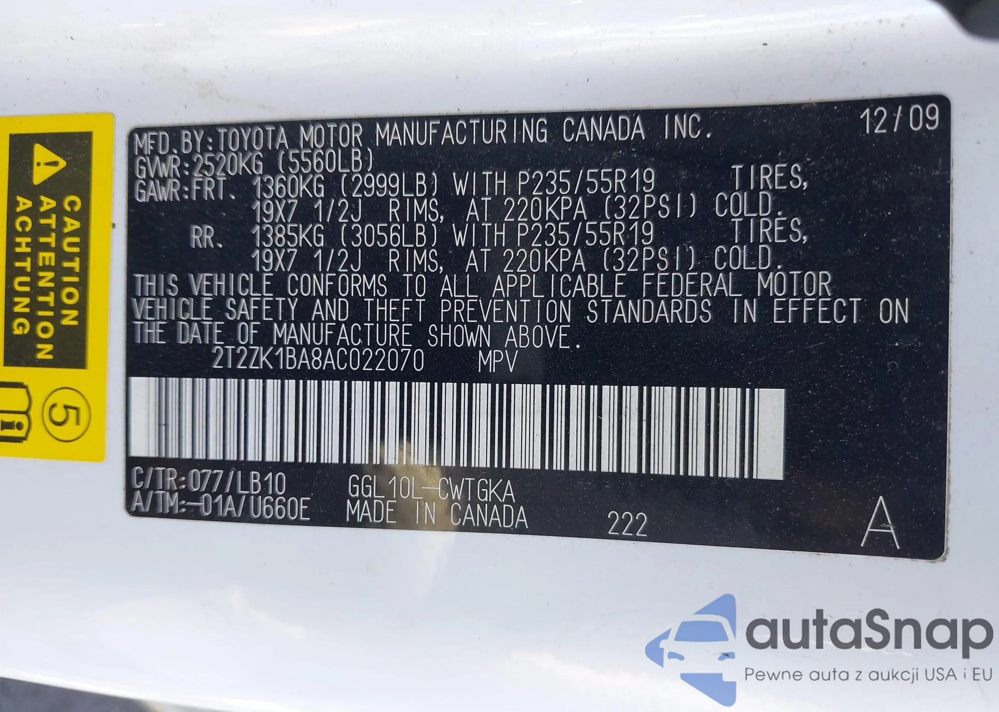 • VIN 2T2ZK1BA8AC022070