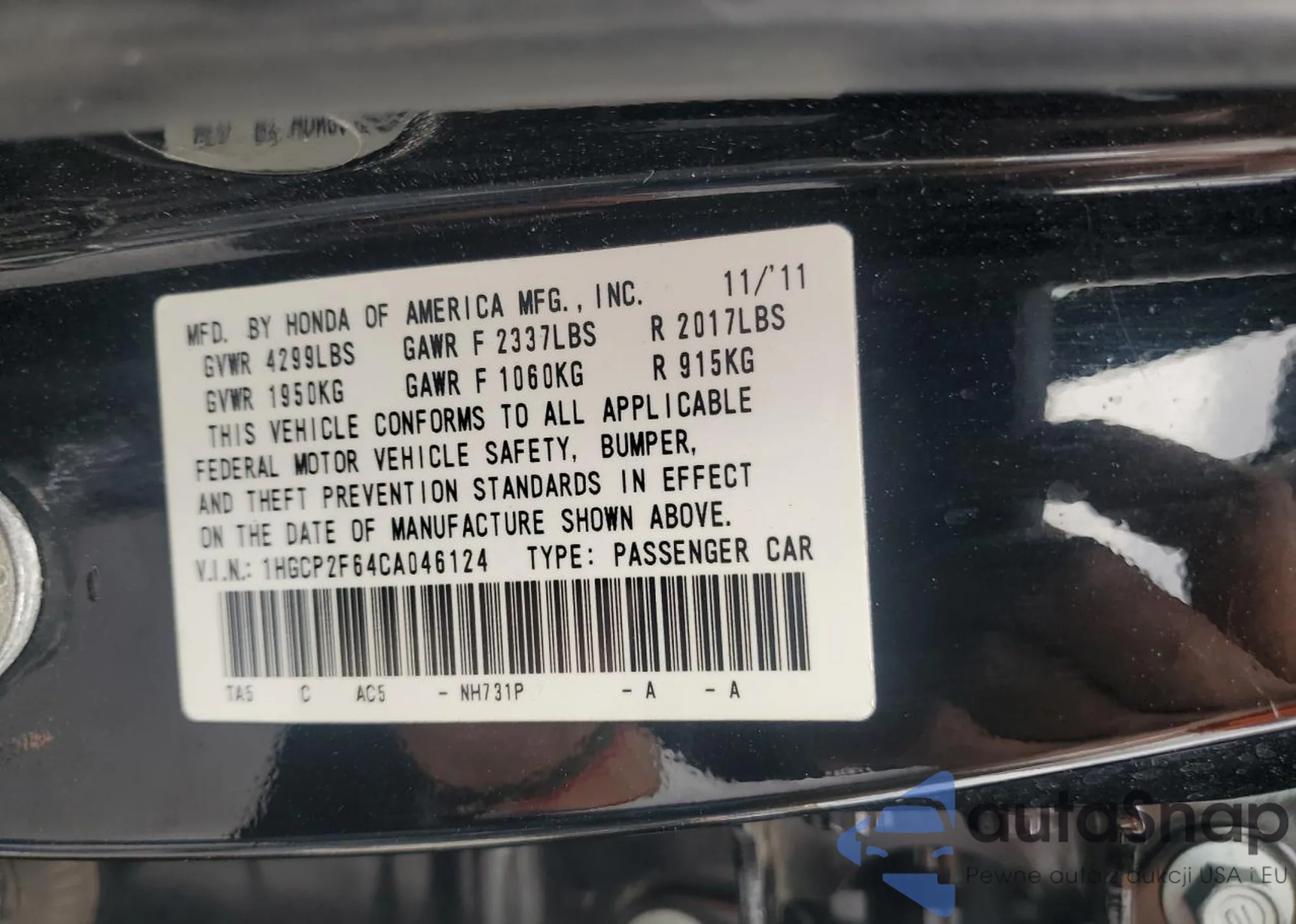 LOT: 51183735 VIN: 1HGCP2F64CA046124