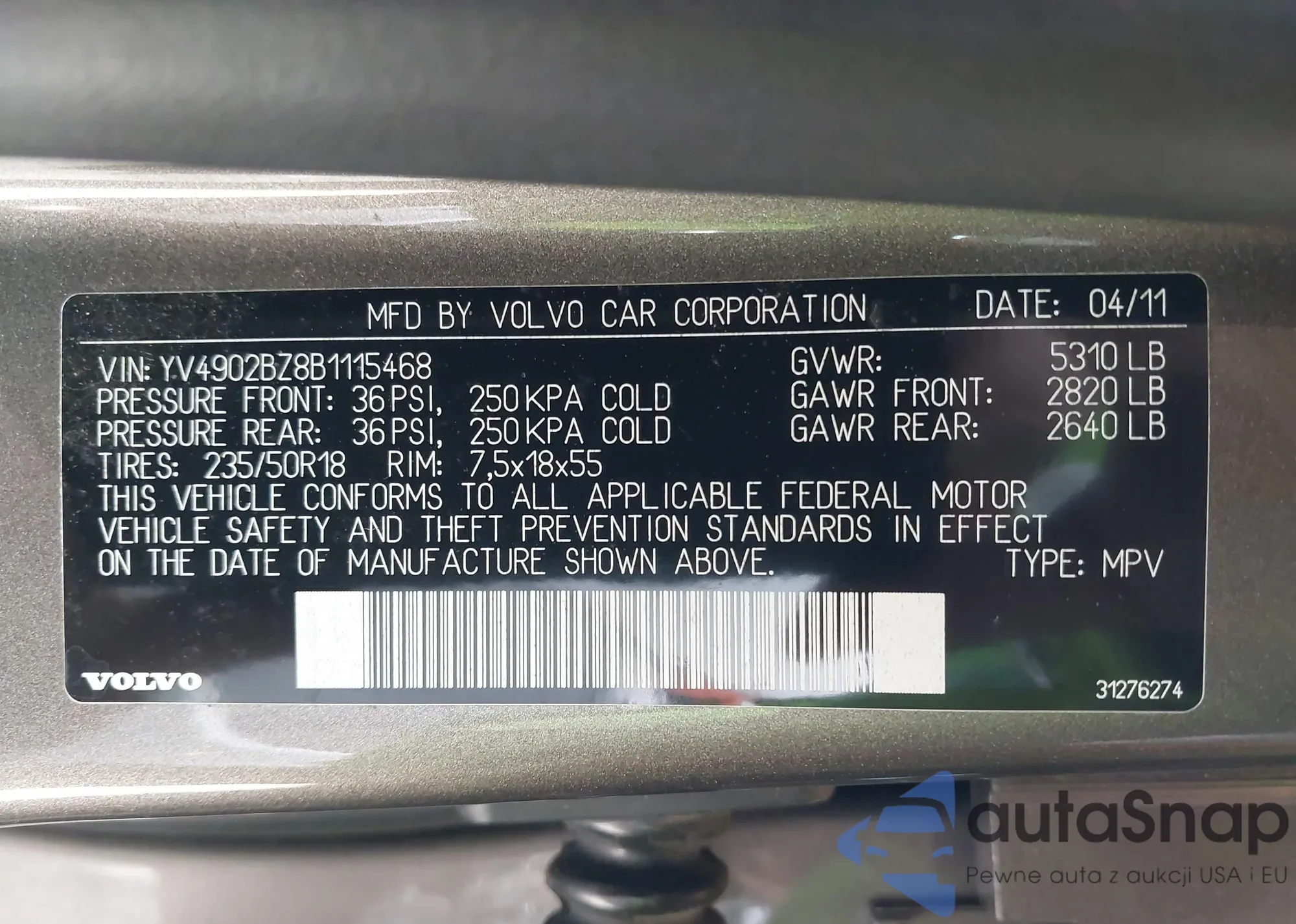 LOT: 42272976 VIN: YV4902BZ8B1115468