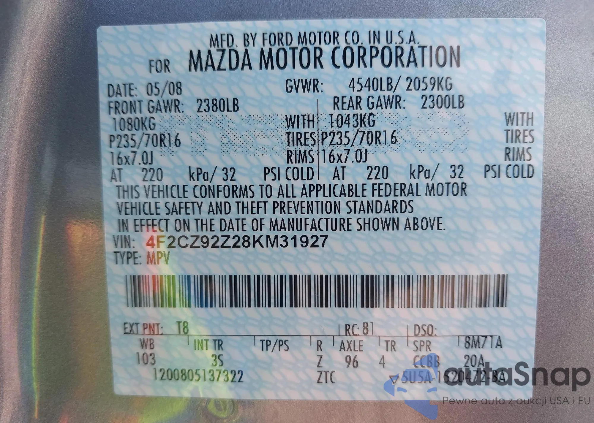 • VIN 4F2CZ92Z28KM31927