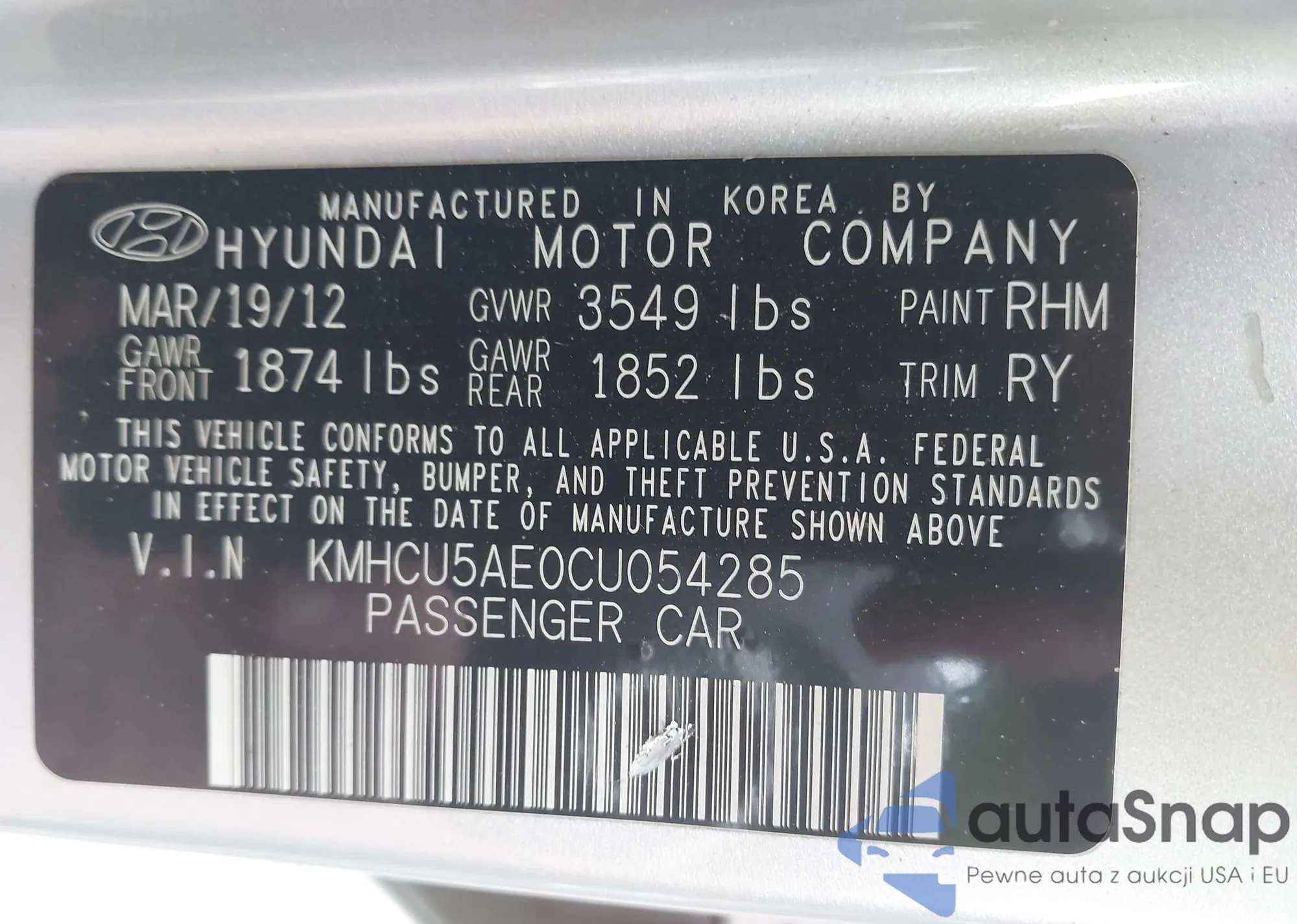 LOT: 42170678 VIN: KMHCU5AE0CU054285