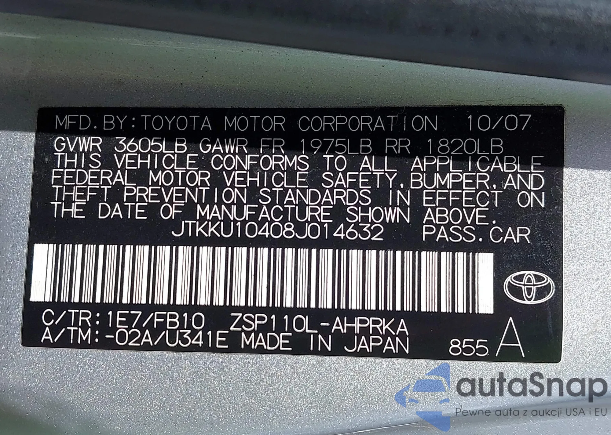 LOT: 42189267 VIN: JTKKU10408J014632