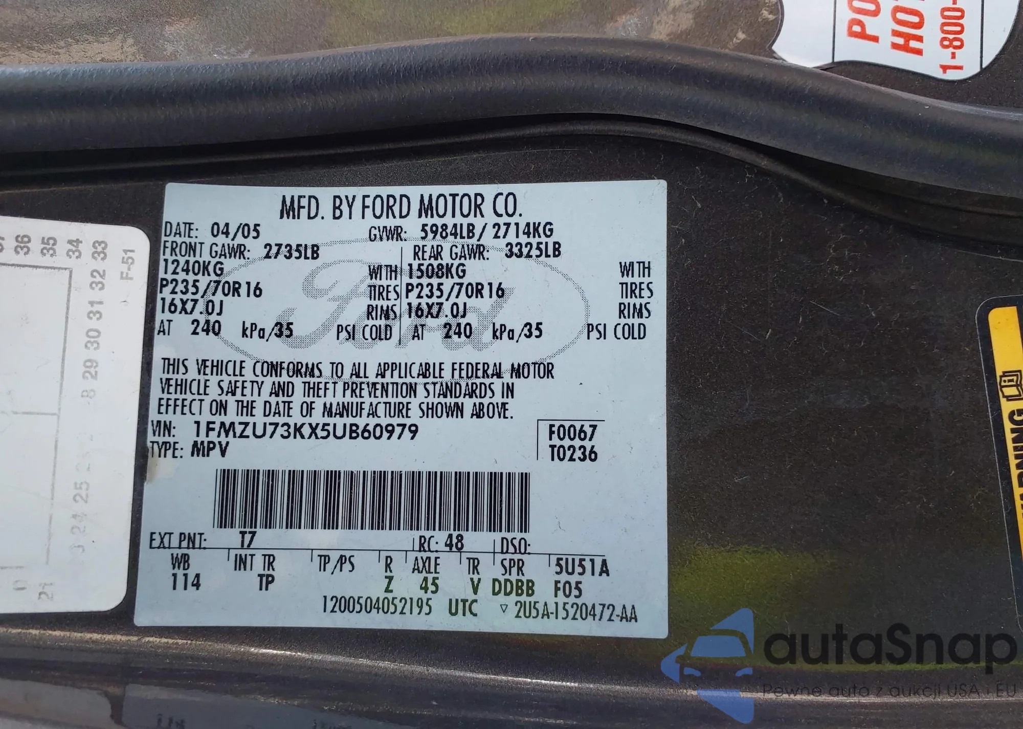 • VIN 1FMZU73KX5UB60979