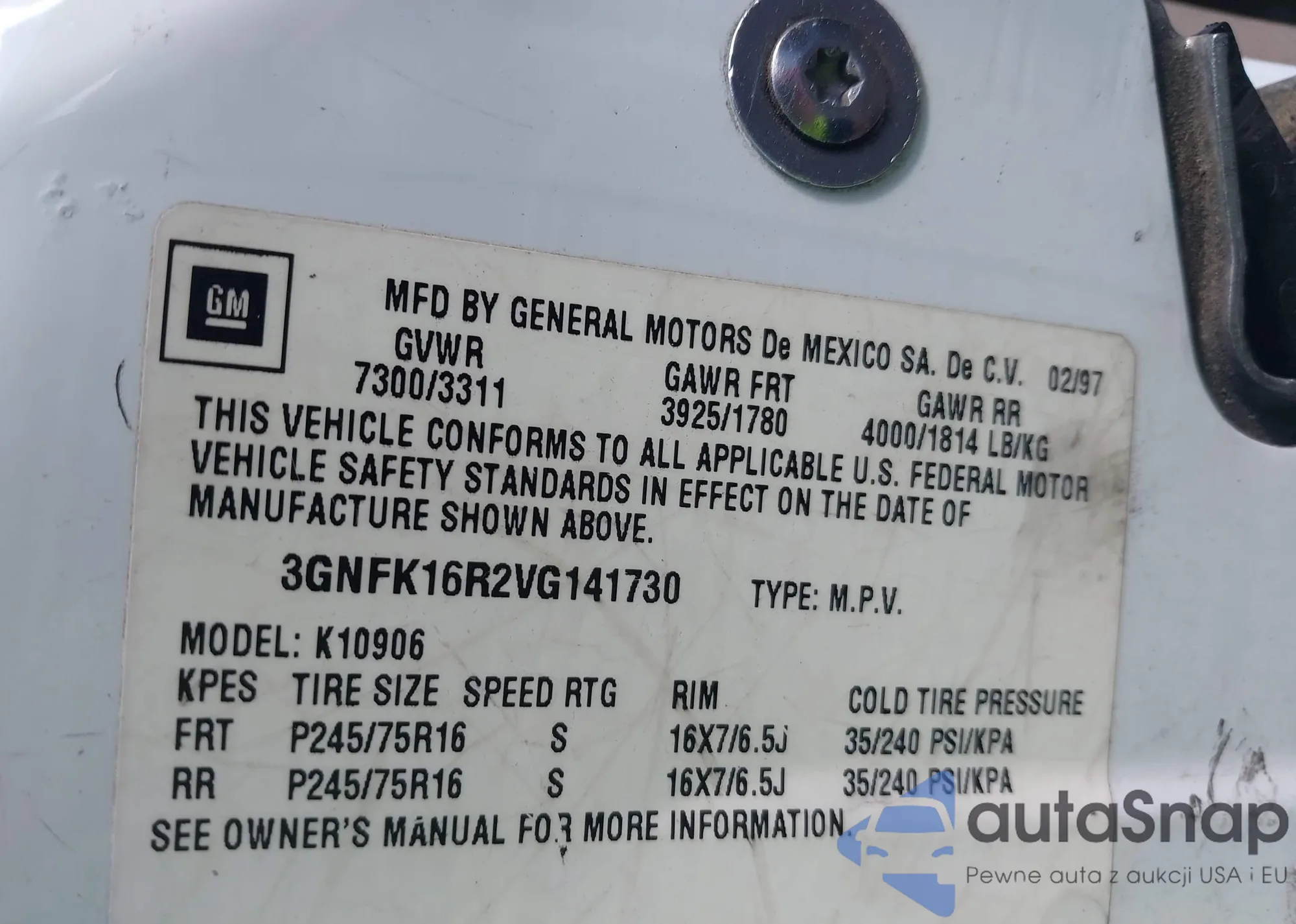 • VIN 3GNFK16R2VG141730