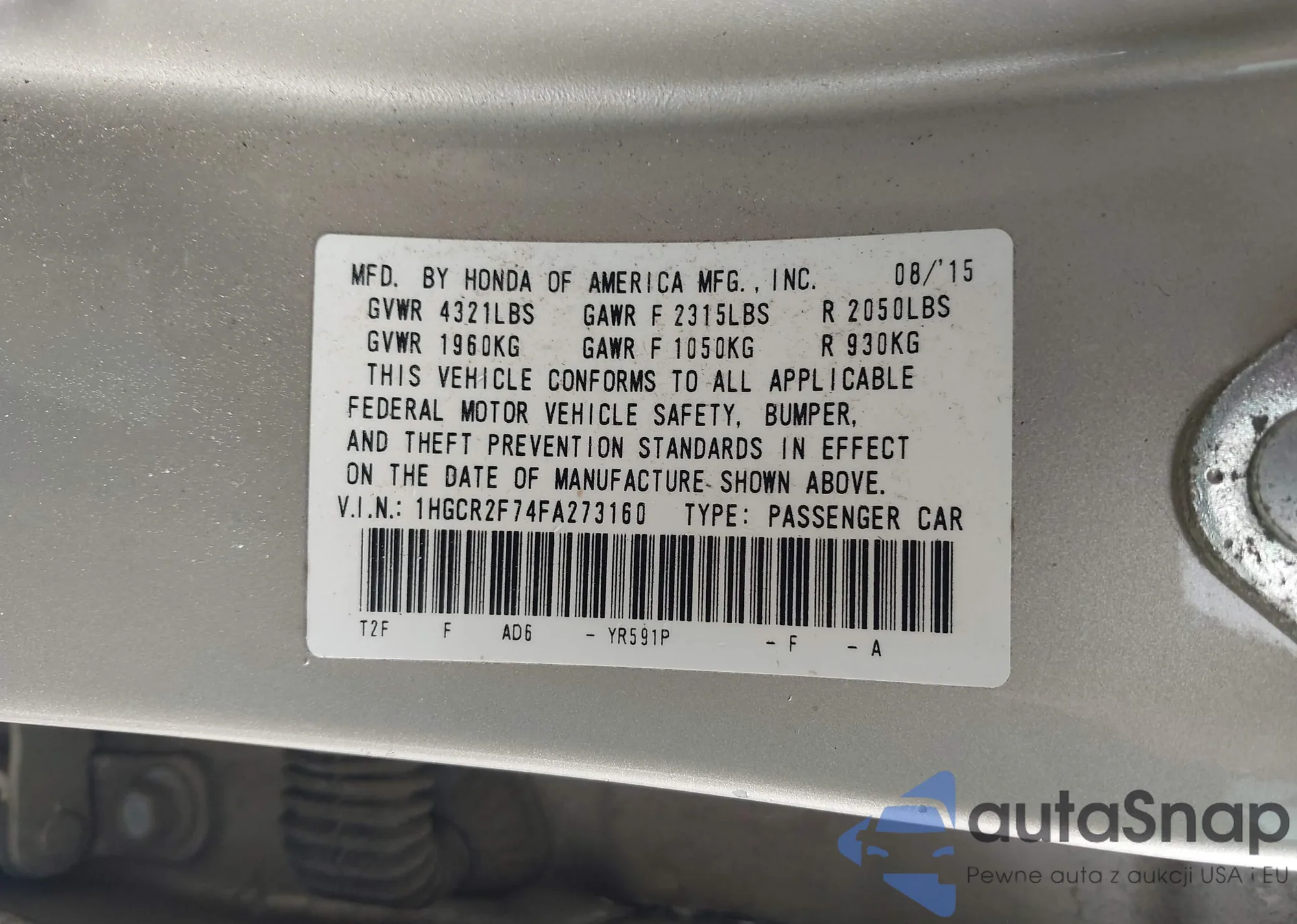 LOT: 41951419 VIN: 1HGCR2F74FA273160