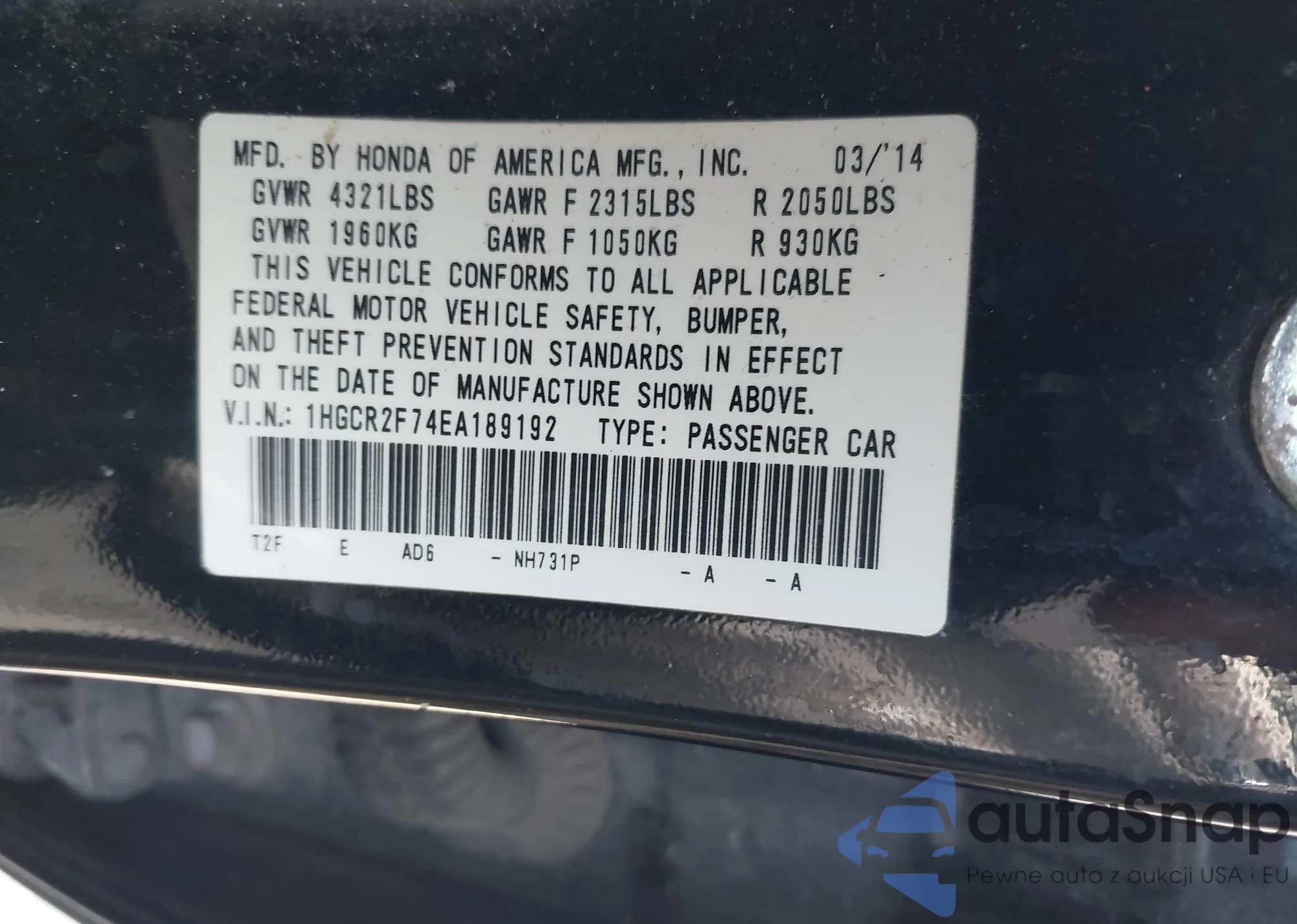 LOT: 42037955 VIN: 1HGCR2F74EA189192