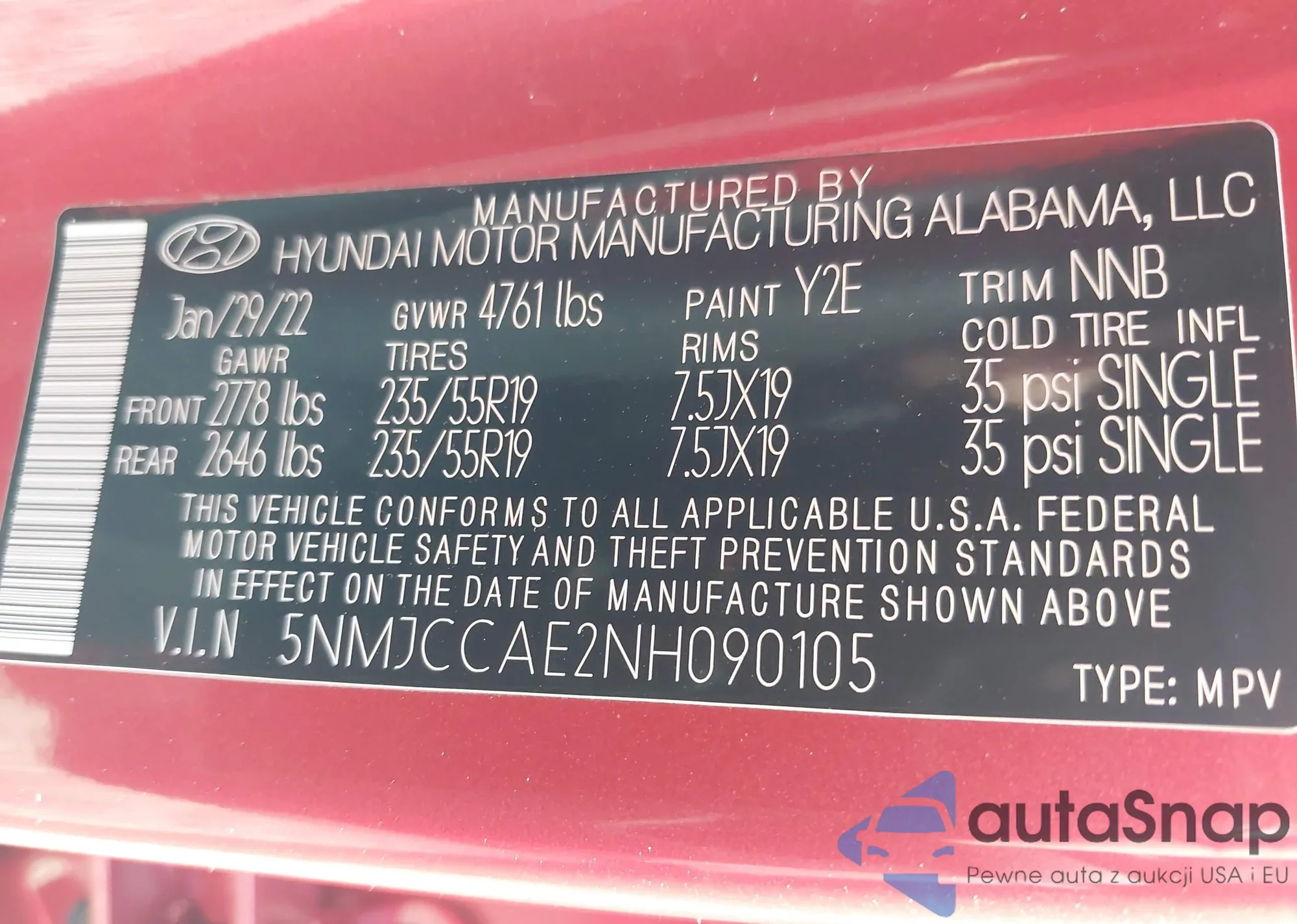 LOT: 42145889 VIN: 5NMJCCAE2NH090105
