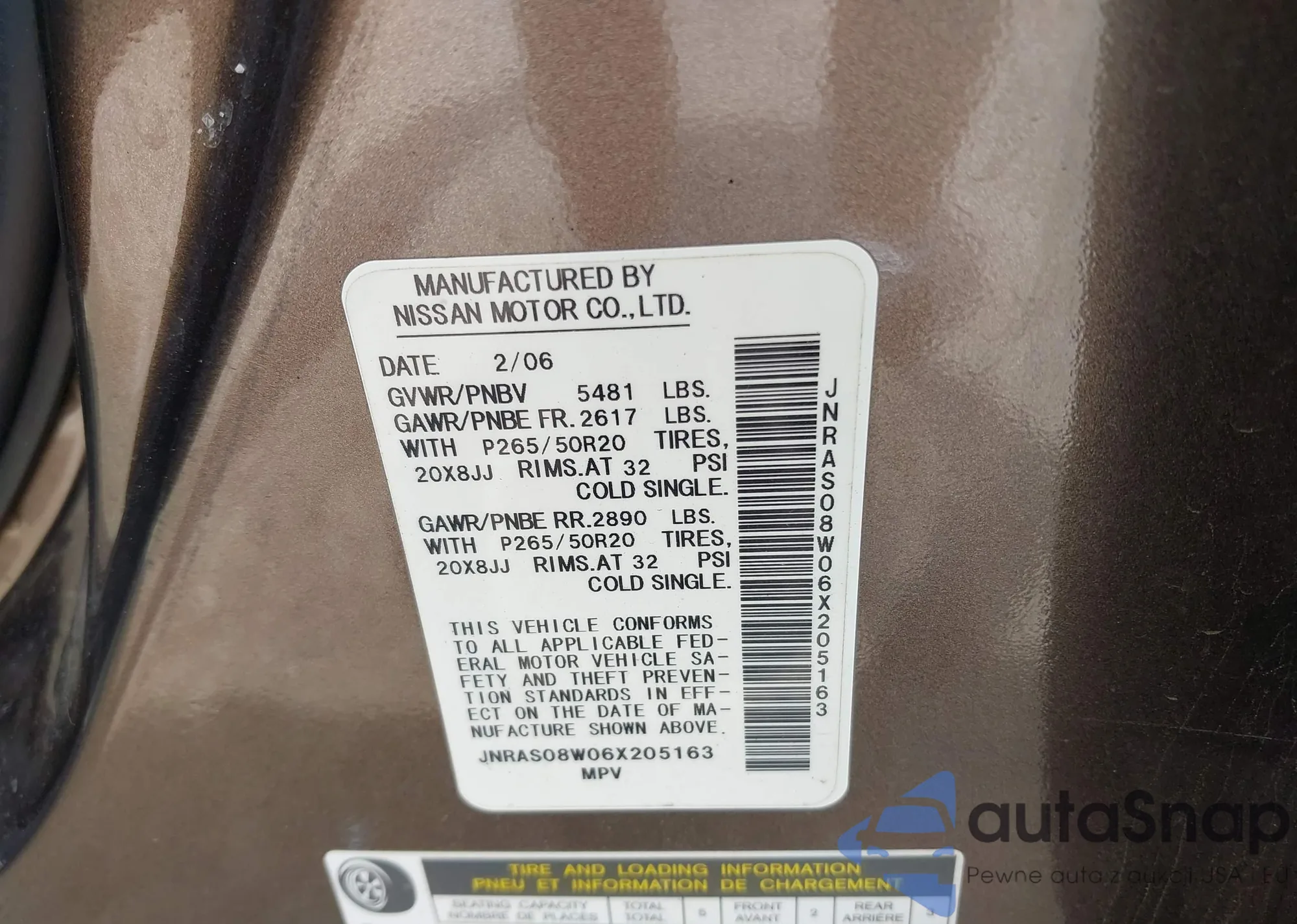 LOT: 42188341 VIN: JNRAS08W06X205163