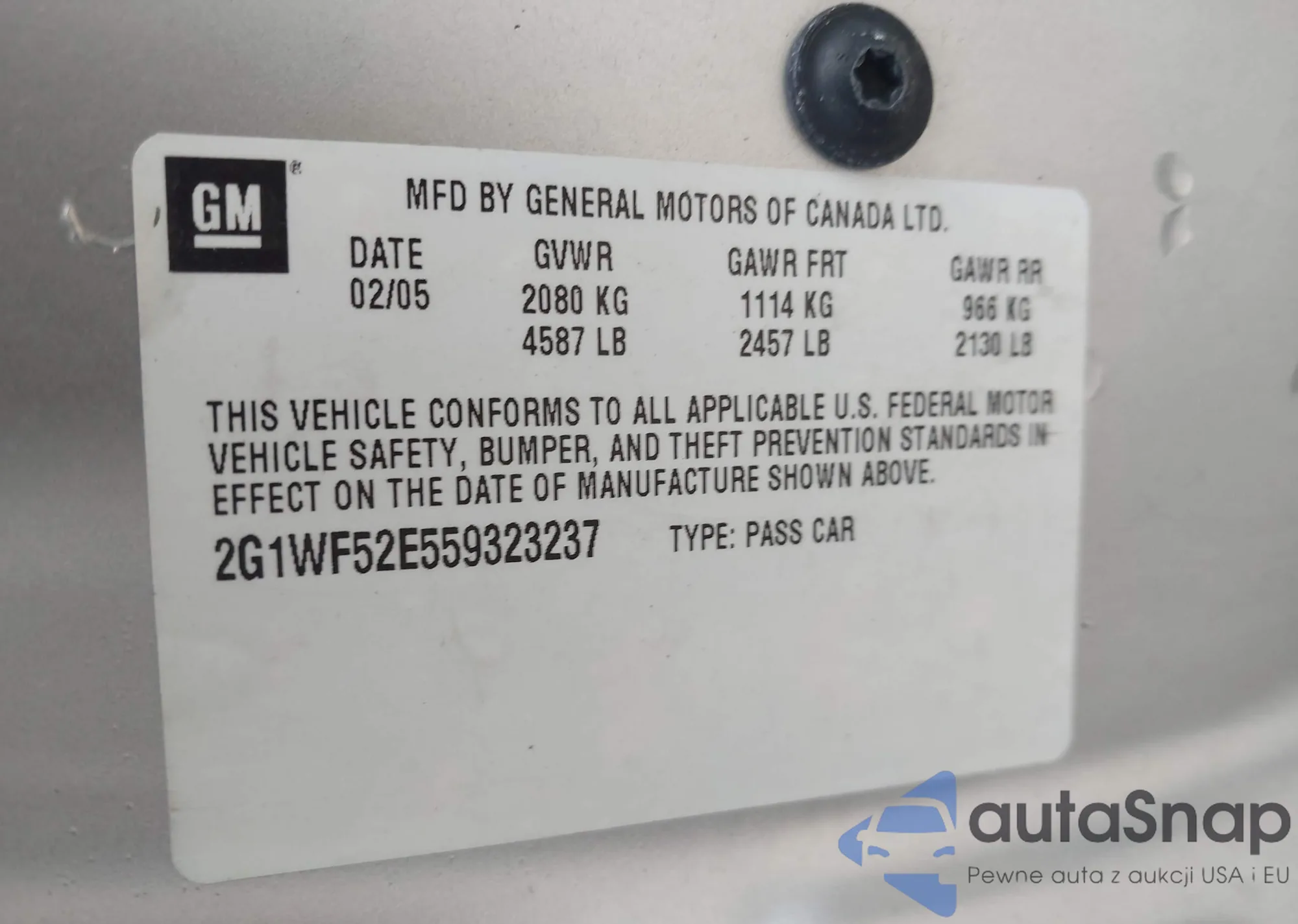 LOT: 42230599 VIN: 2G1WF52E559323237