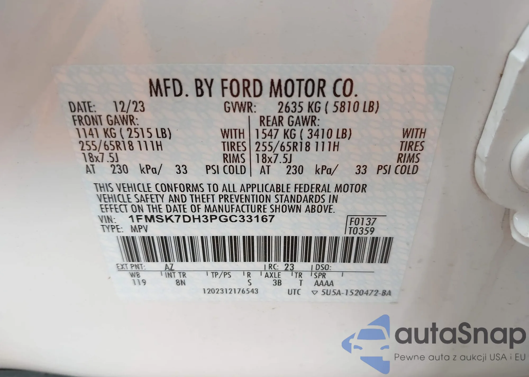 LOT: 42241818 VIN: 1FMSK7DH3PGC33167