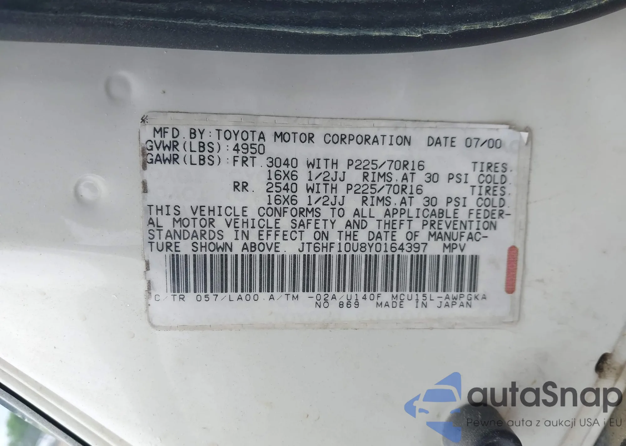 LOT: 42228737 VIN: JT6HF10U8Y0164397