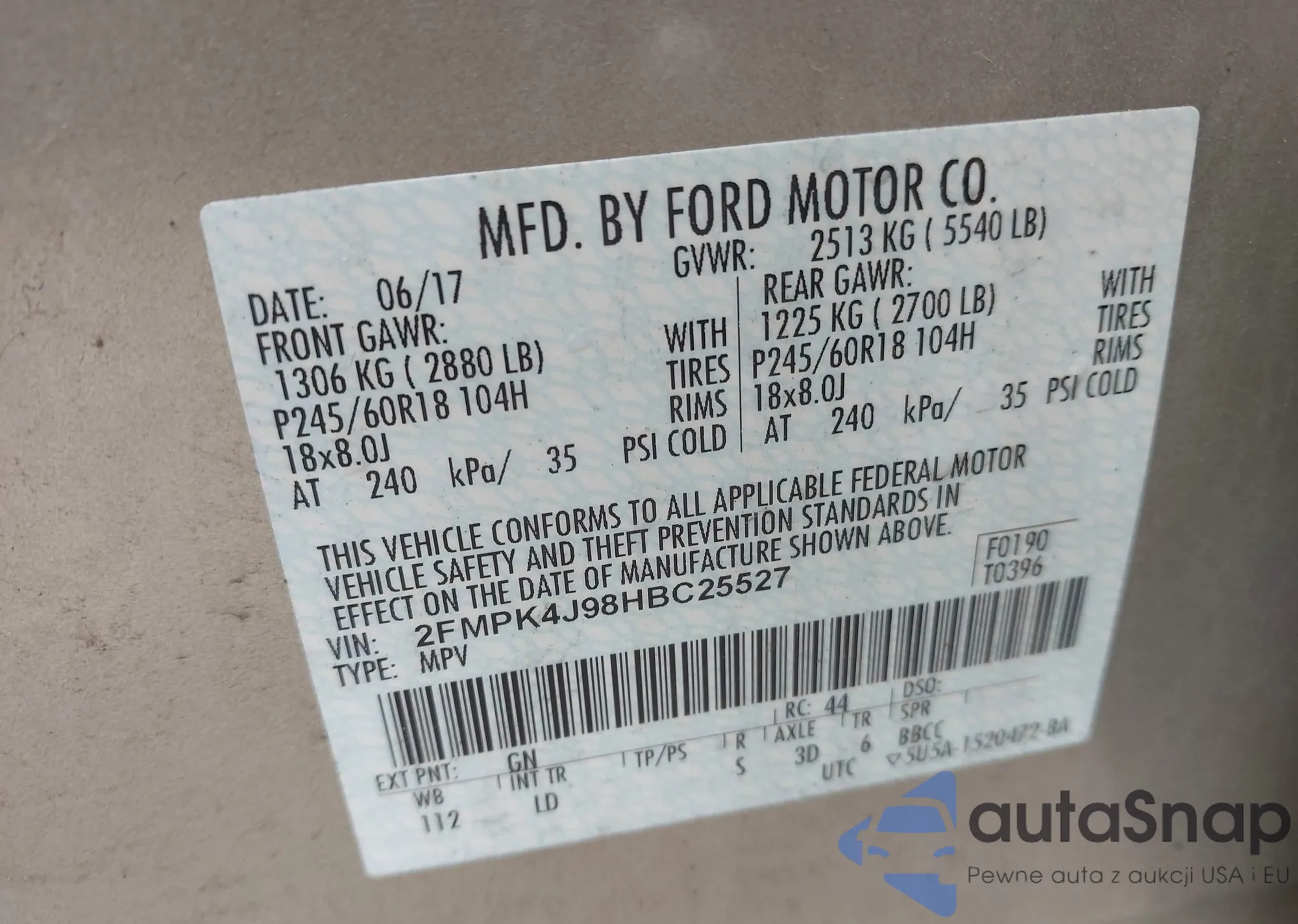 LOT: 42235699 VIN: 2FMPK4J98HBC25527