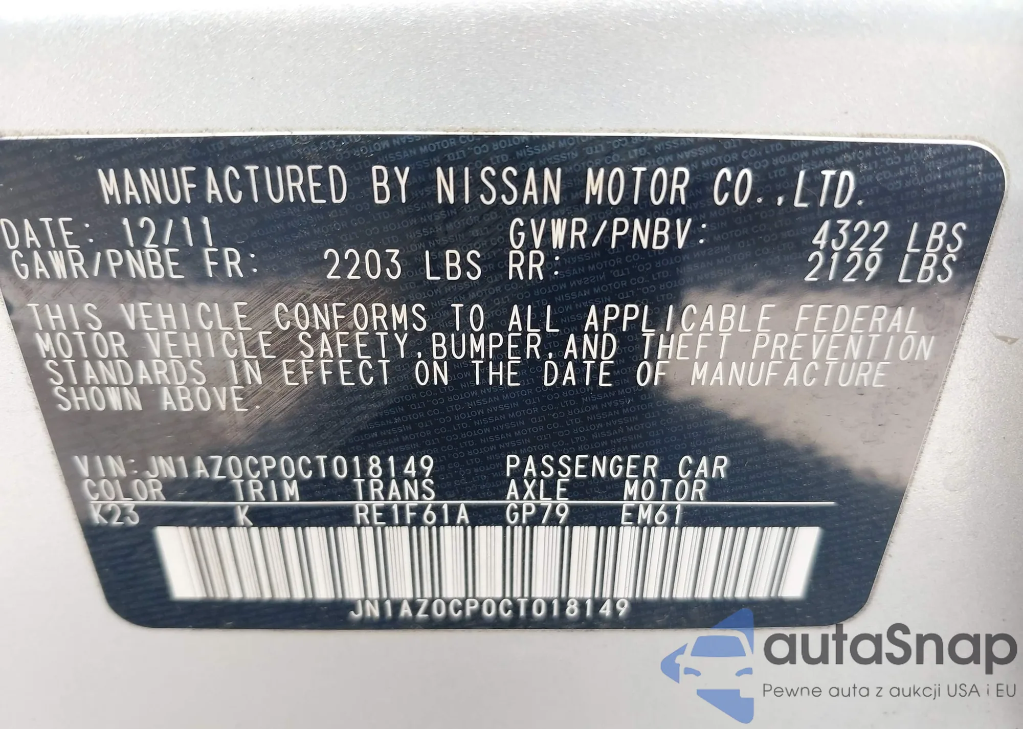 LOT: 42260874 VIN: JN1AZ0CP0CT018149