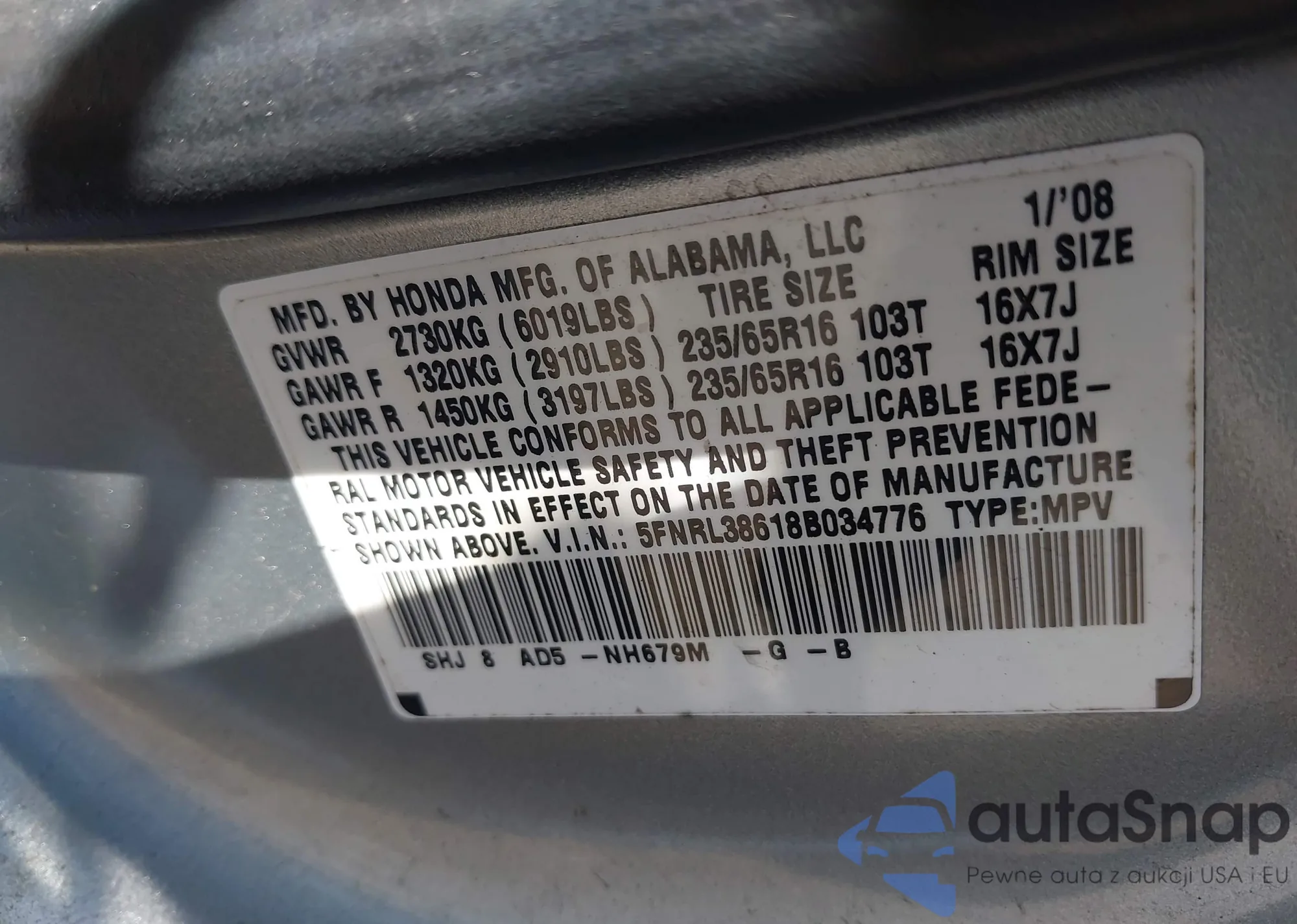 • VIN 5FNRL38618B034776