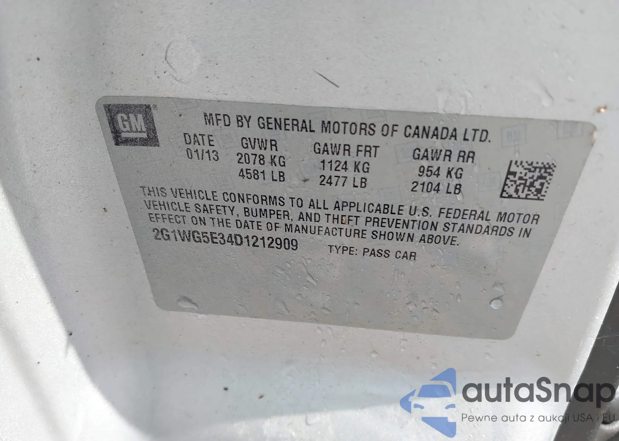LOT: 41939341 VIN: 2G1WG5E34D1212909