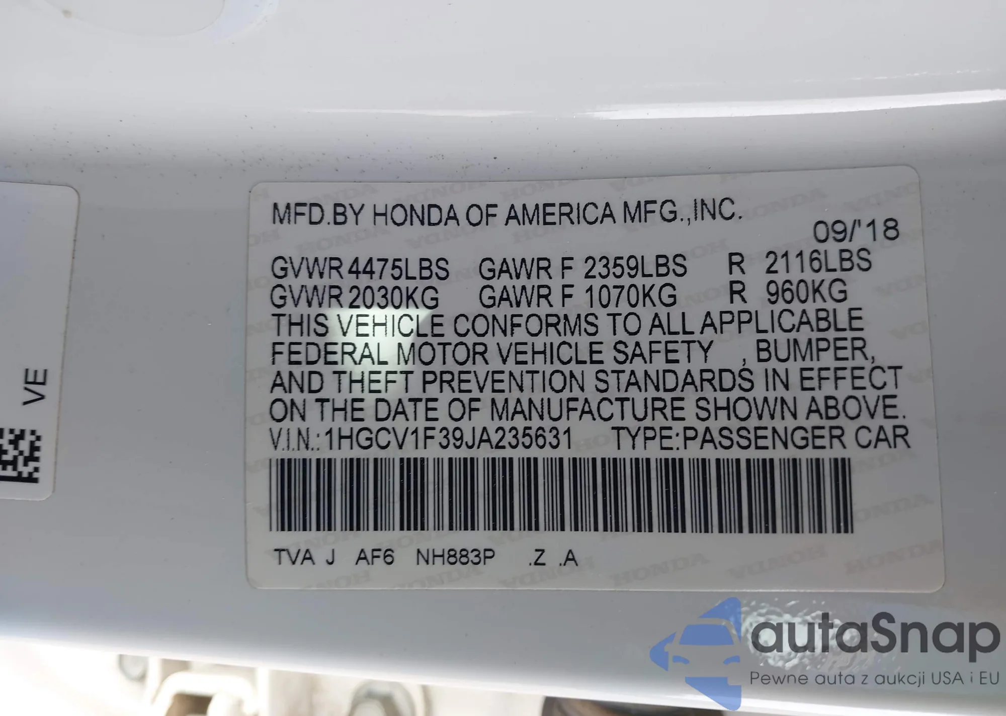 LOT: 41946068 VIN: 1HGCV1F39JA235631