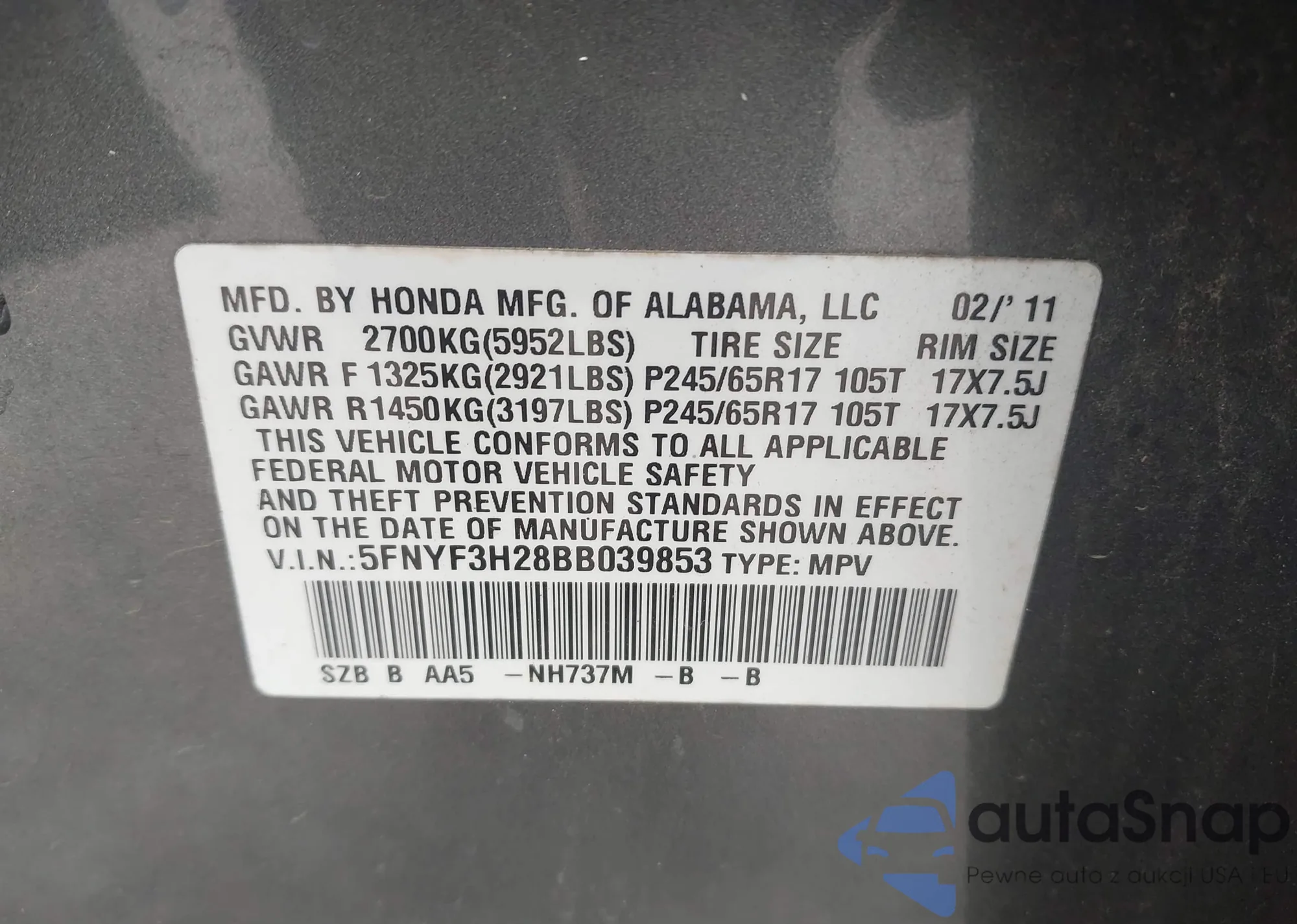 • VIN 5FNYF3H28BB039853