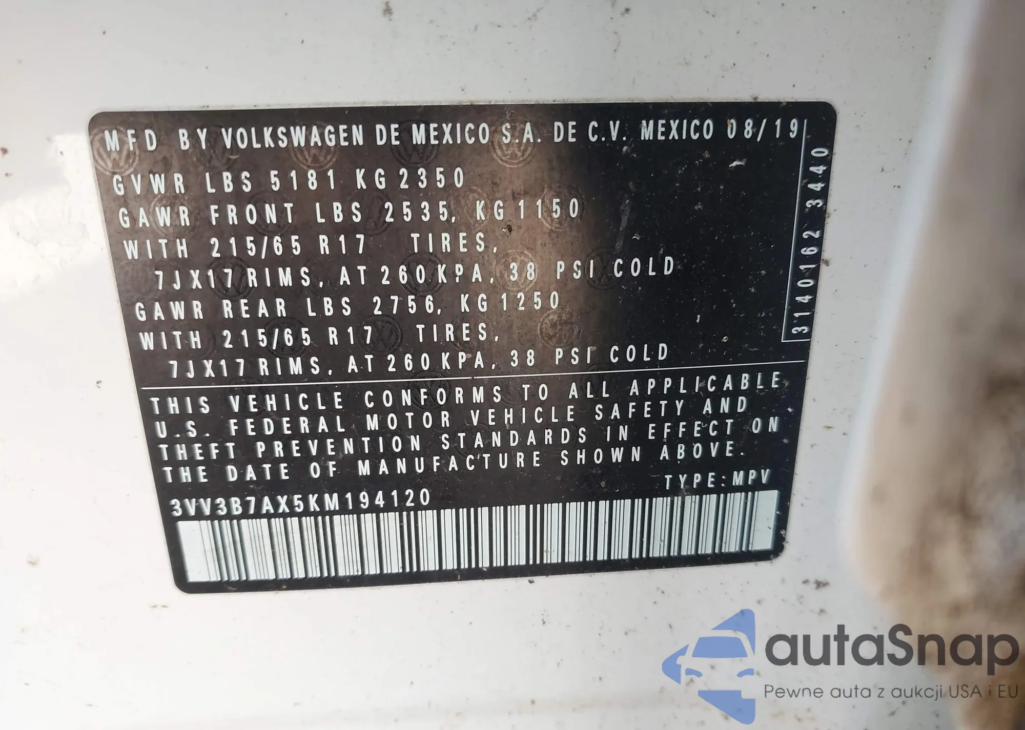 • VIN 3VV3B7AX5KM194120