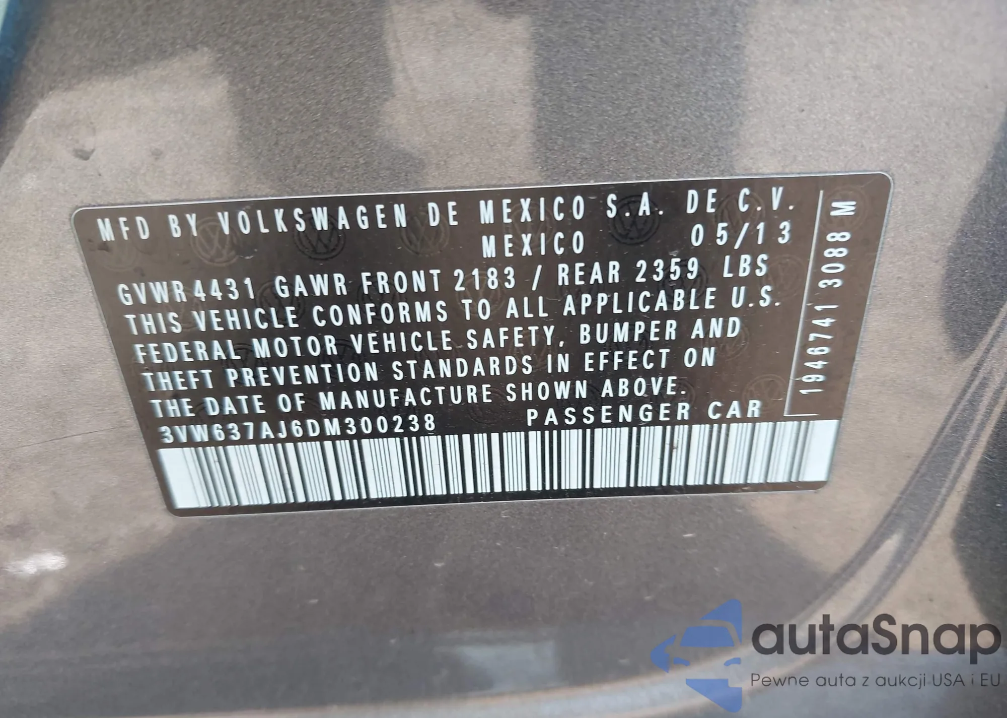 • VIN 3VW637AJ6DM300238