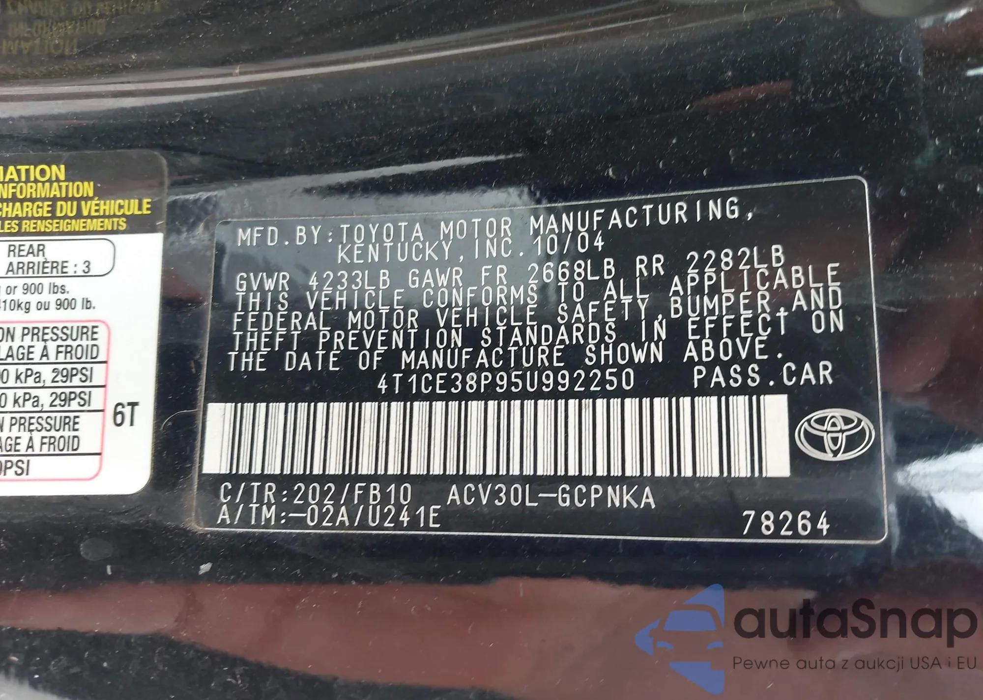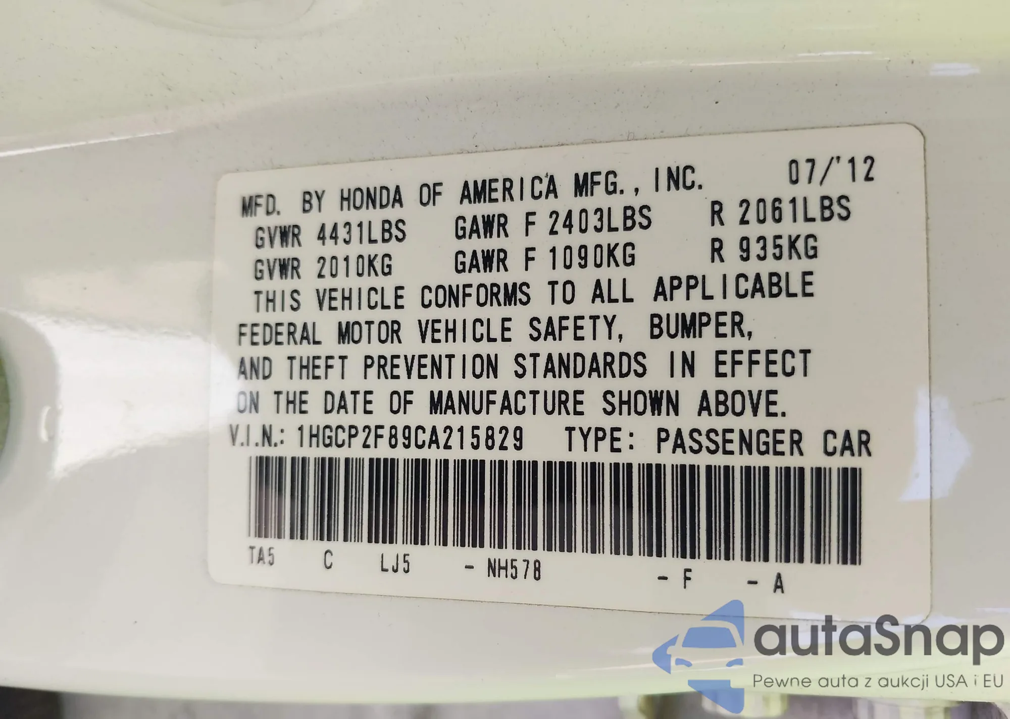 LOT: 42124710 VIN: 1HGCP2F89CA215829