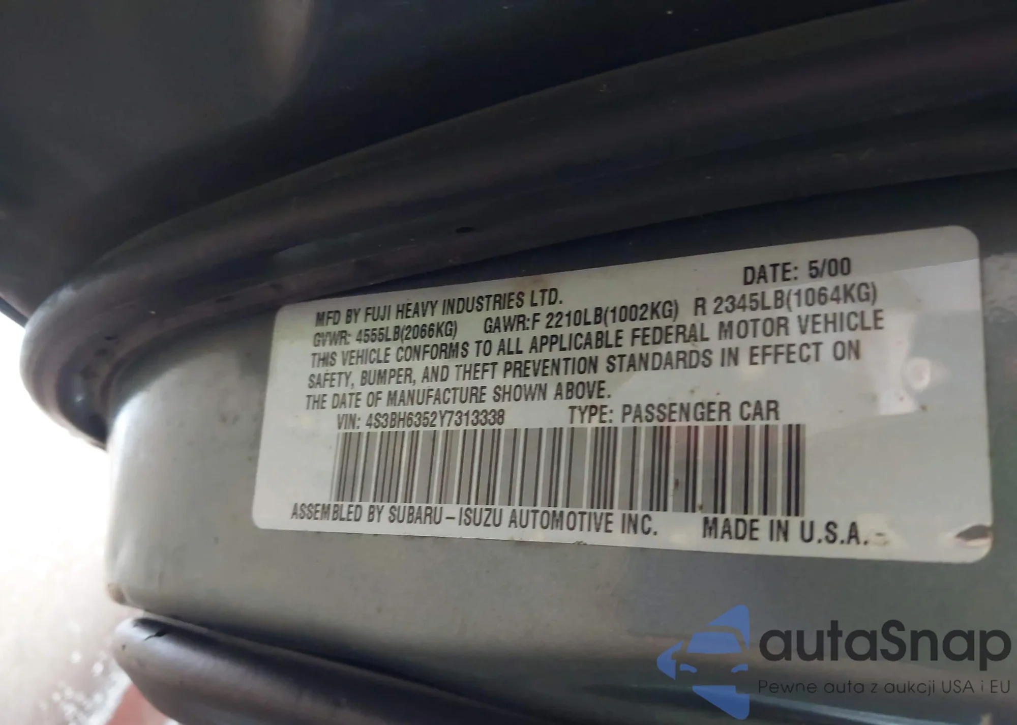 LOT: 42117837 VIN: 4S3BH6352Y7313338