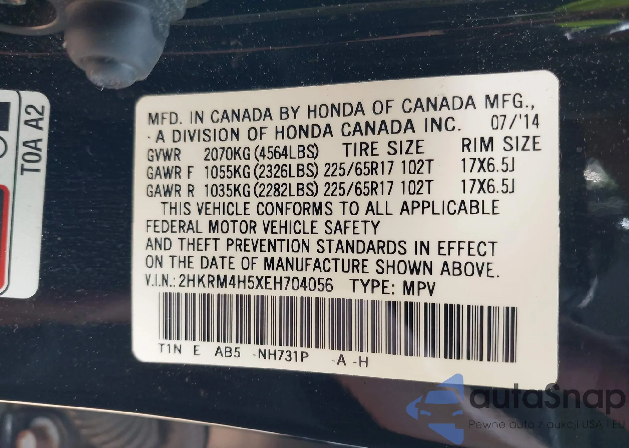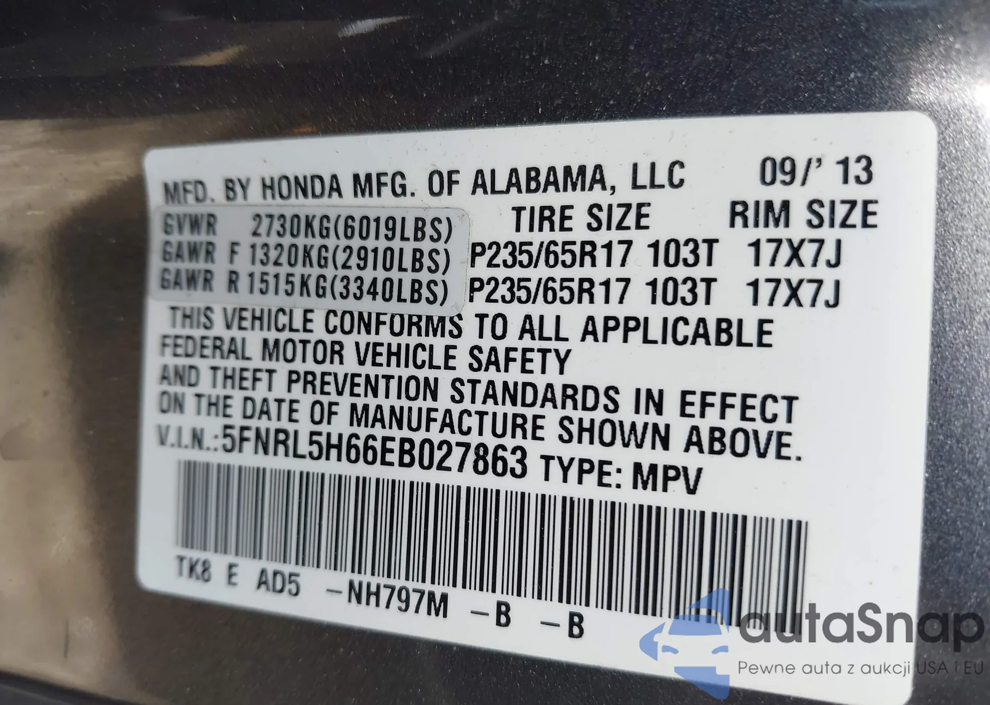 • VIN 5FNRL5H66EB027863