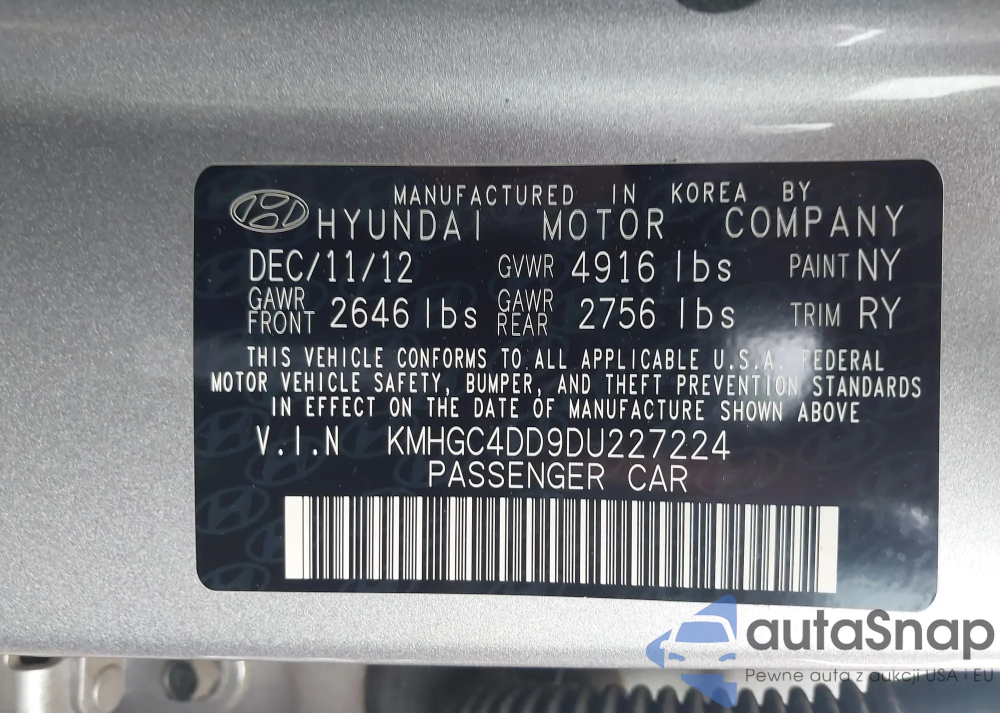 LOT: 42129862 VIN: KMHGC4DD9DU227224